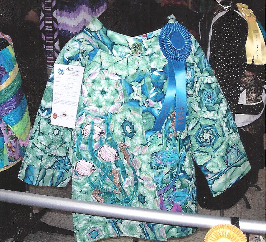 In 2008 I won first place in the Tidewater Quilters Guild Show, Virginia Beach, VA for Wearable Art. I called it “Head Above Water”. I used the One Block Wonder process for the blocks. I laid down the pattern and designed the blocks over it until I couldn’t see the pattern anymore, then I sewed the blocks together, repined them to the pattern piece and cut out the pattern using Indygo Junction Retro Raglan Jacket IJ764. I thought it looked like water, so I machine embroidered fish swimming on it.