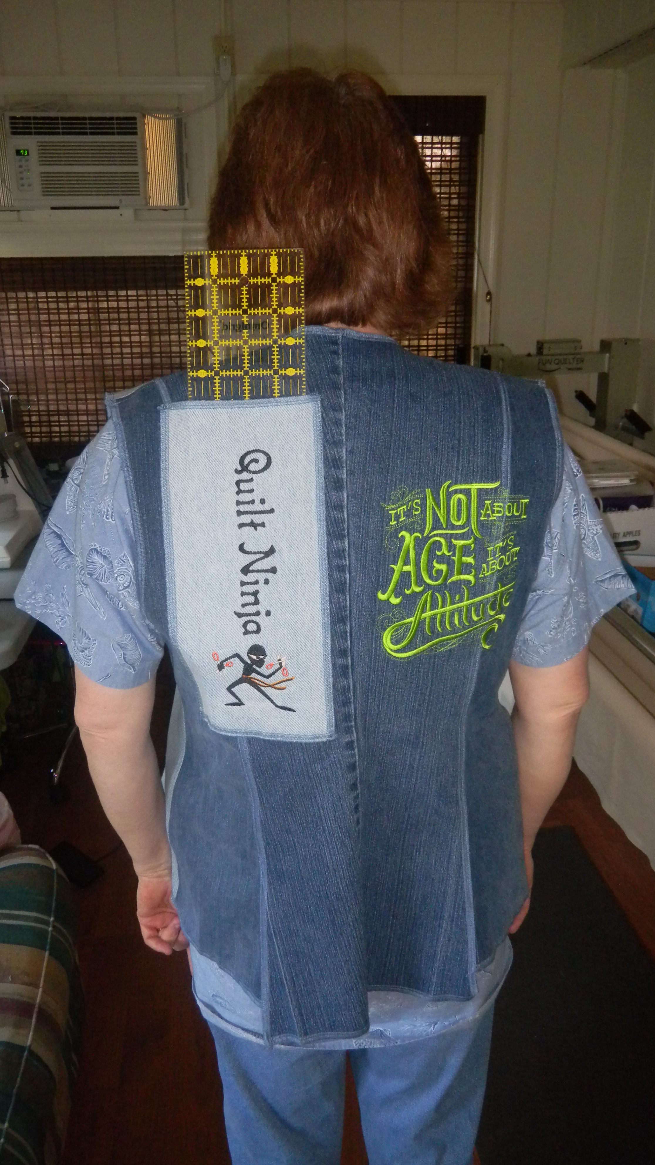 The Quilt Ninja was born in 2008 When I entered and won First Place in the Virginia Consortium Of Quilter’s (VCQ) Apron Contest. I used Indygo Junction pattern Sewing Smock IJ694, but gave it my own twist by machine embroidering the pockets with quilting designs. I would reach around and grip the ruler from the pocket on my back while simultaneously whipping out my rotary cutter and crying out “Quilt Ninja”! The Quilt Ninja has been my alter ego ever since. This year I remade the vest using the Easy Silhouette Vest IJ730 because I lost 50 pounds.