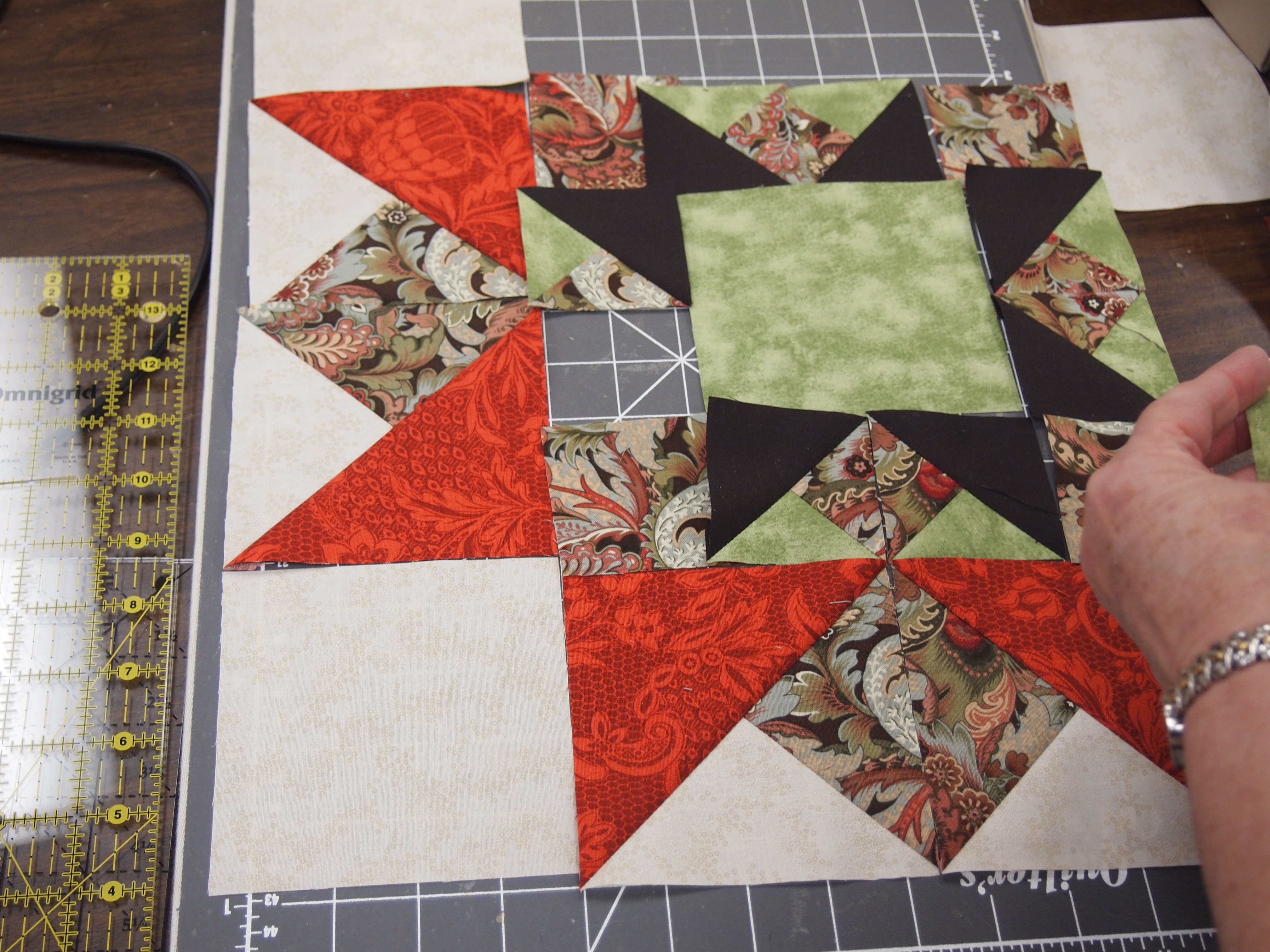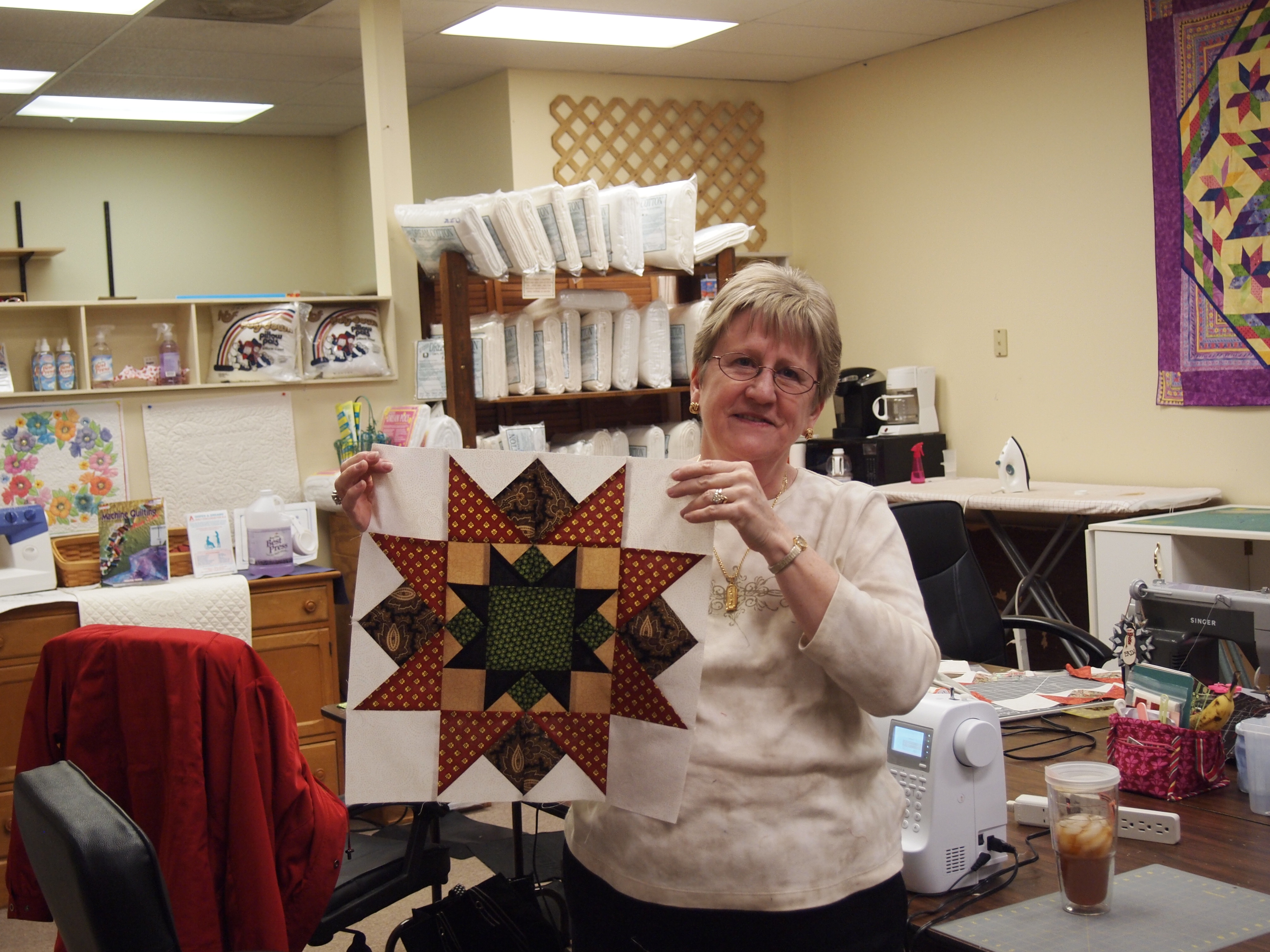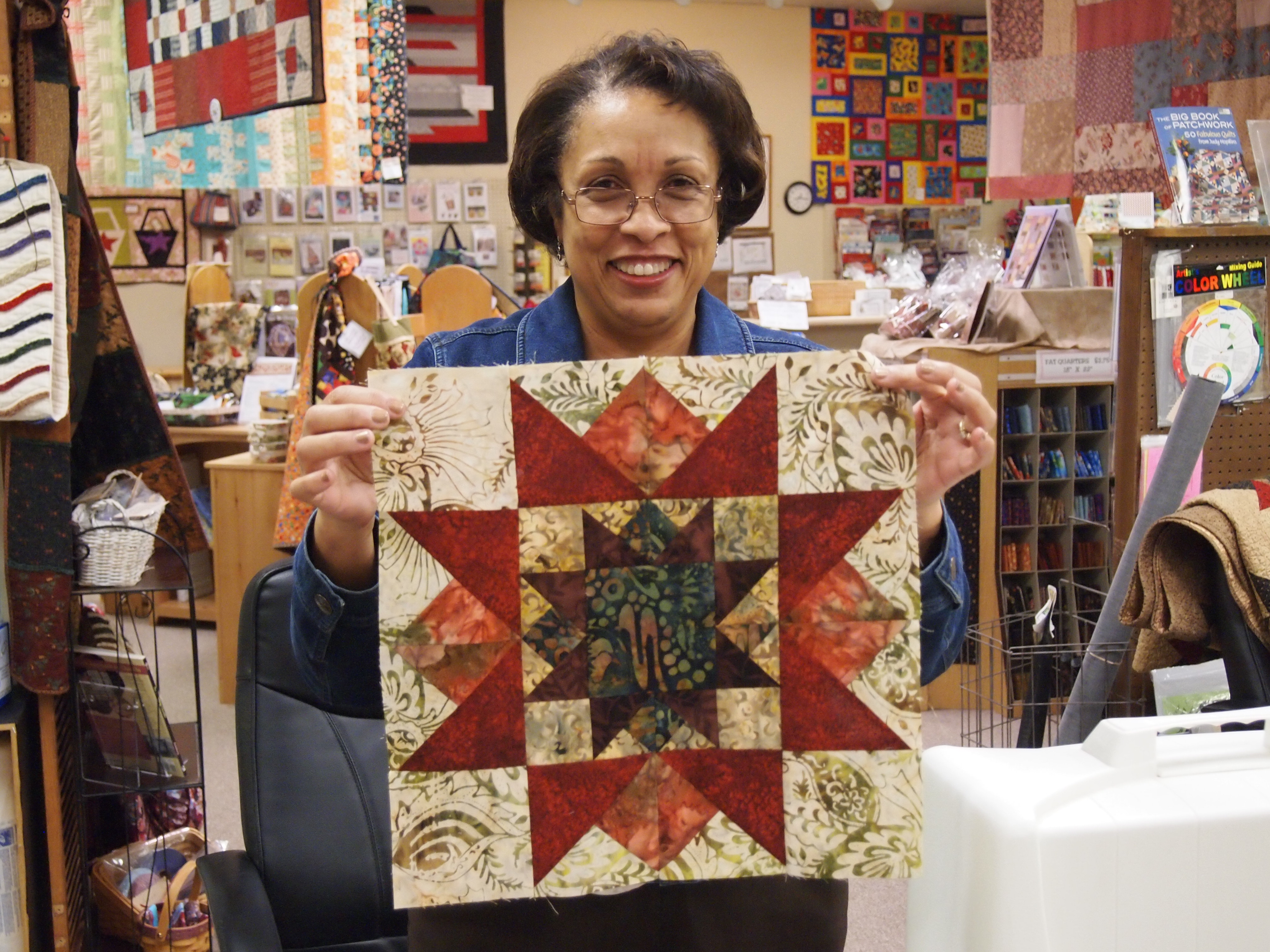 I taught a class last night at What’s Your Stitch N Stuff in Virginia Beach making the quilt pattern “Oak Ridge Stars” using the Tucker Trimmer by Deb Tucker. I love Deb’s patterns. She goes into great detail so you understand exactly what to do. We used the Tucker Trimmer to square up pieces so when we put our blocks together they are perfect. You can buy Deb Tucker procducts at your local quilt shop or www.studio180design.net . On their webite are videos to show how to use their great products.