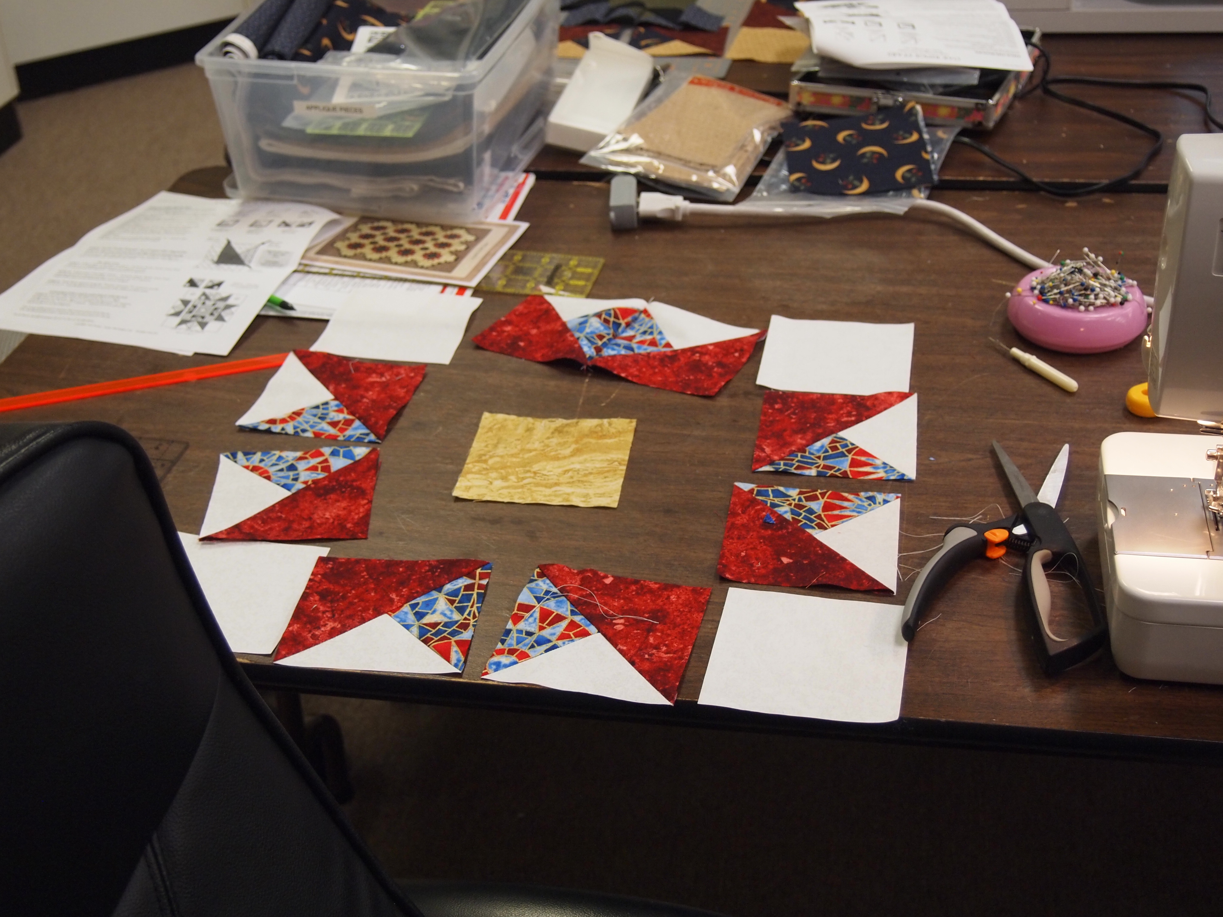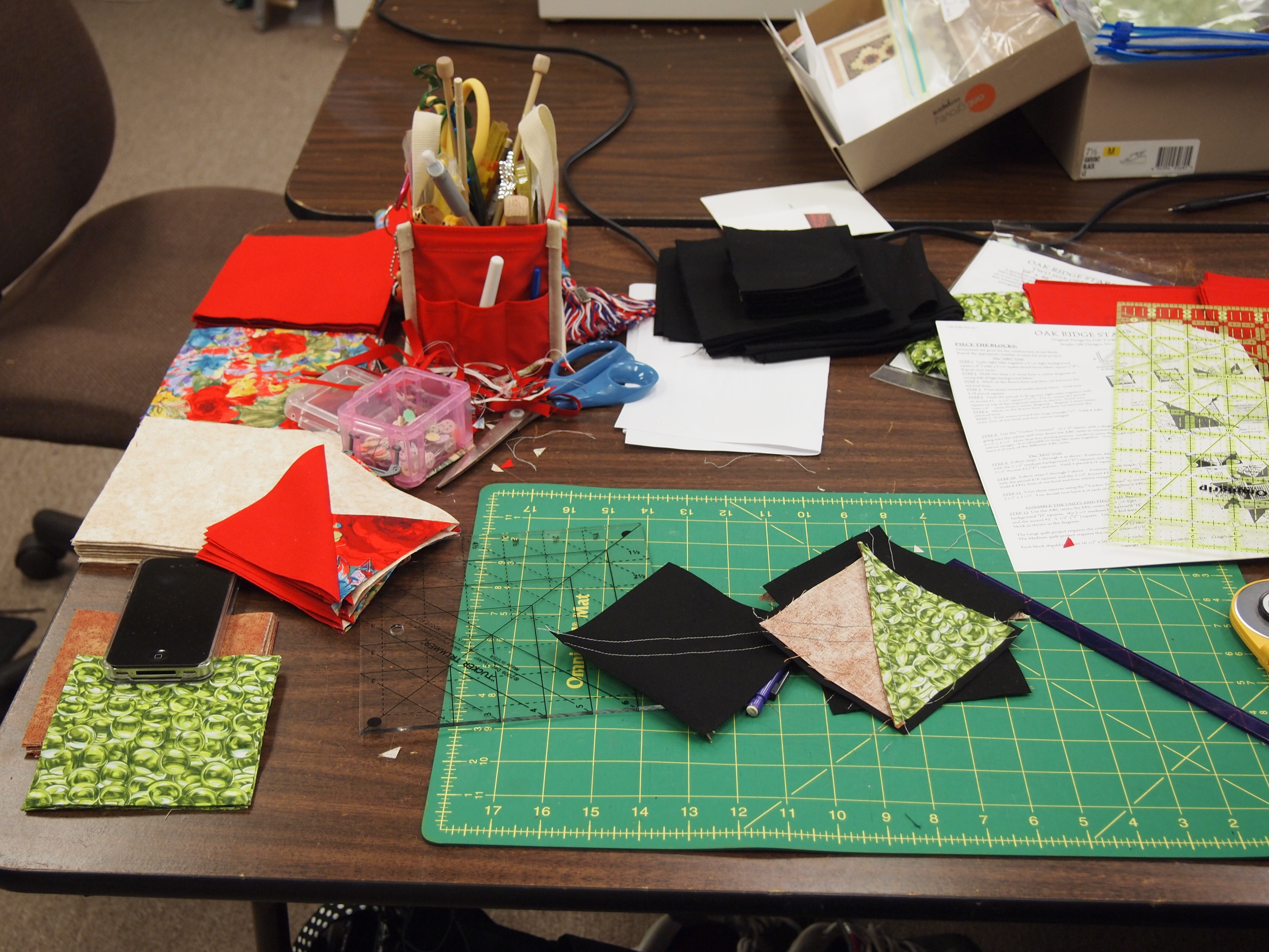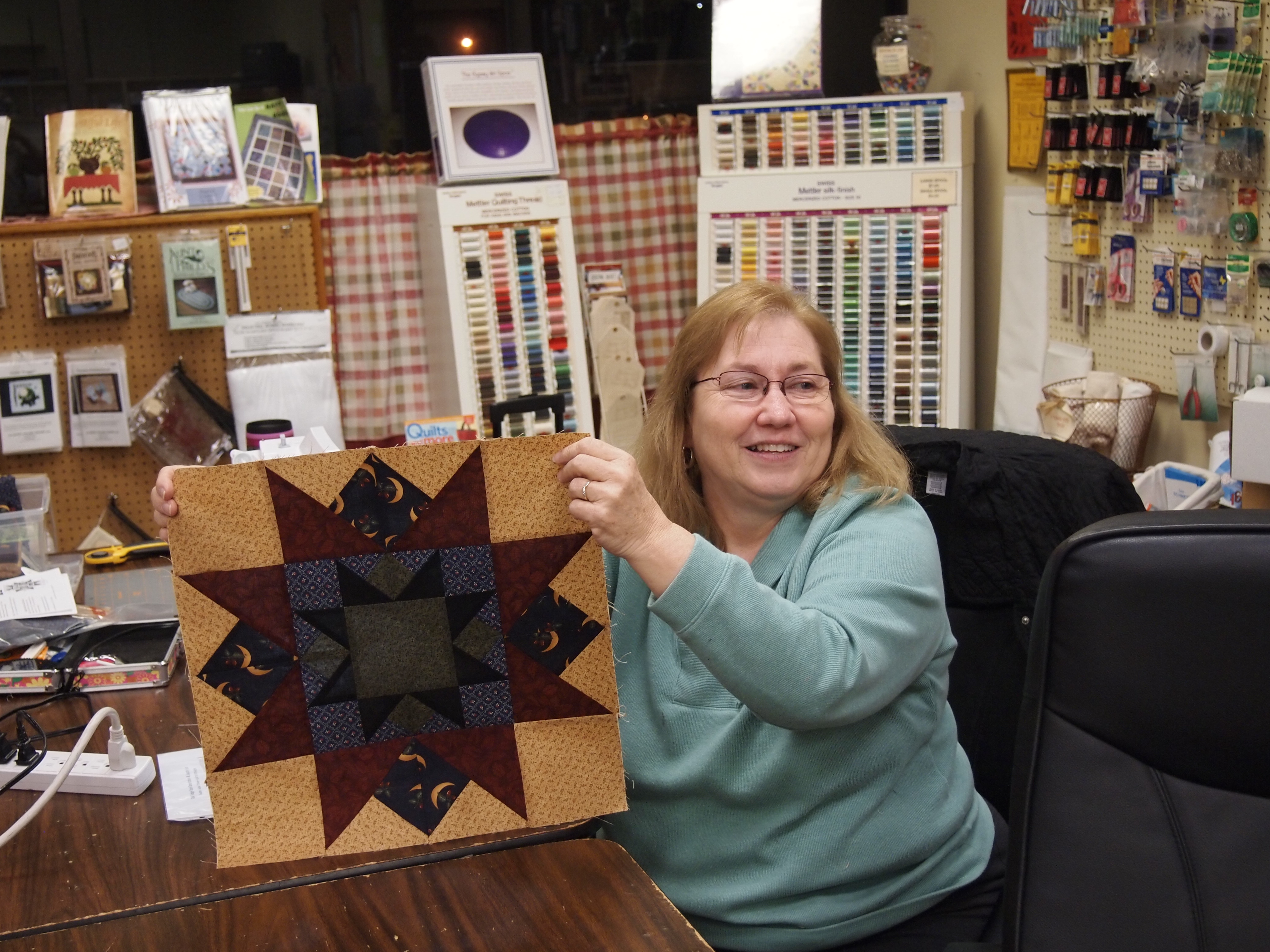 I taught a class last night at What’s Your Stitch N Stuff in Virginia Beach making the quilt pattern “Oak Ridge Stars” using the Tucker Trimmer by Deb Tucker. I love Deb’s patterns. She goes into great detail so you understand exactly what to do. We used the Tucker Trimmer to square up pieces so when we put our blocks together they are perfect. You can buy Deb Tucker procducts at your local quilt shop or www.studio180design.net . On their webite are videos to show how to use their great products.
