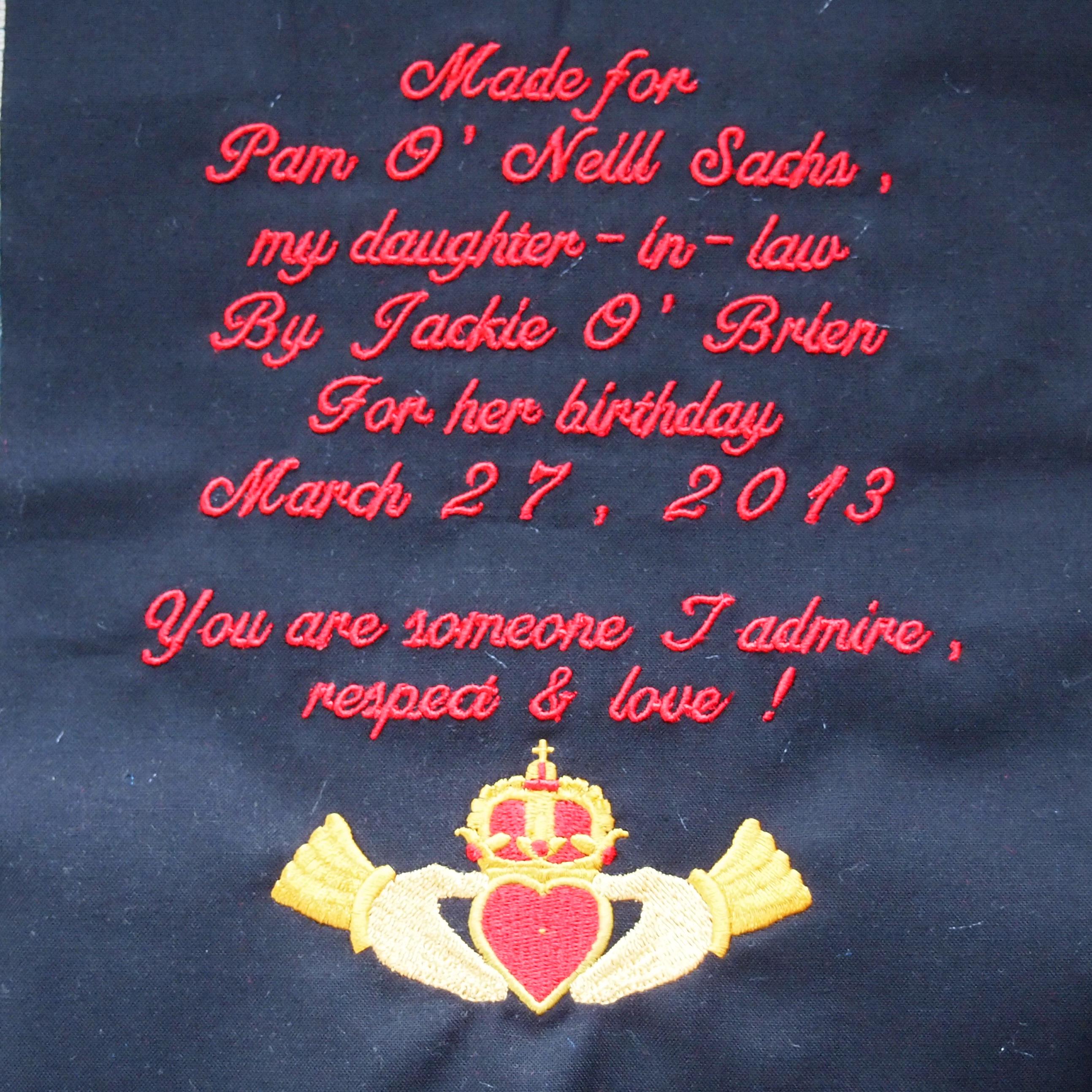 My wonderful daughter-in-law Pam is having a birthday next week. I’m spilling the beans a littler early. I made her this King size quilt to celebrate her birthday, she loves red! It measures 100 inches by 120 inches, phew, that was work! I always make a gift bag for the quilts I make, but this one is too big to fit in the bag. I love Pam, she makes my son very happy! Now they have a lot to be happy about, they are expecting a daughter in August. I’m so happy for them (& I’m happy for myself, a new grandchild to play with and love)! Happy Birthday Pam! I’ll see you next week!