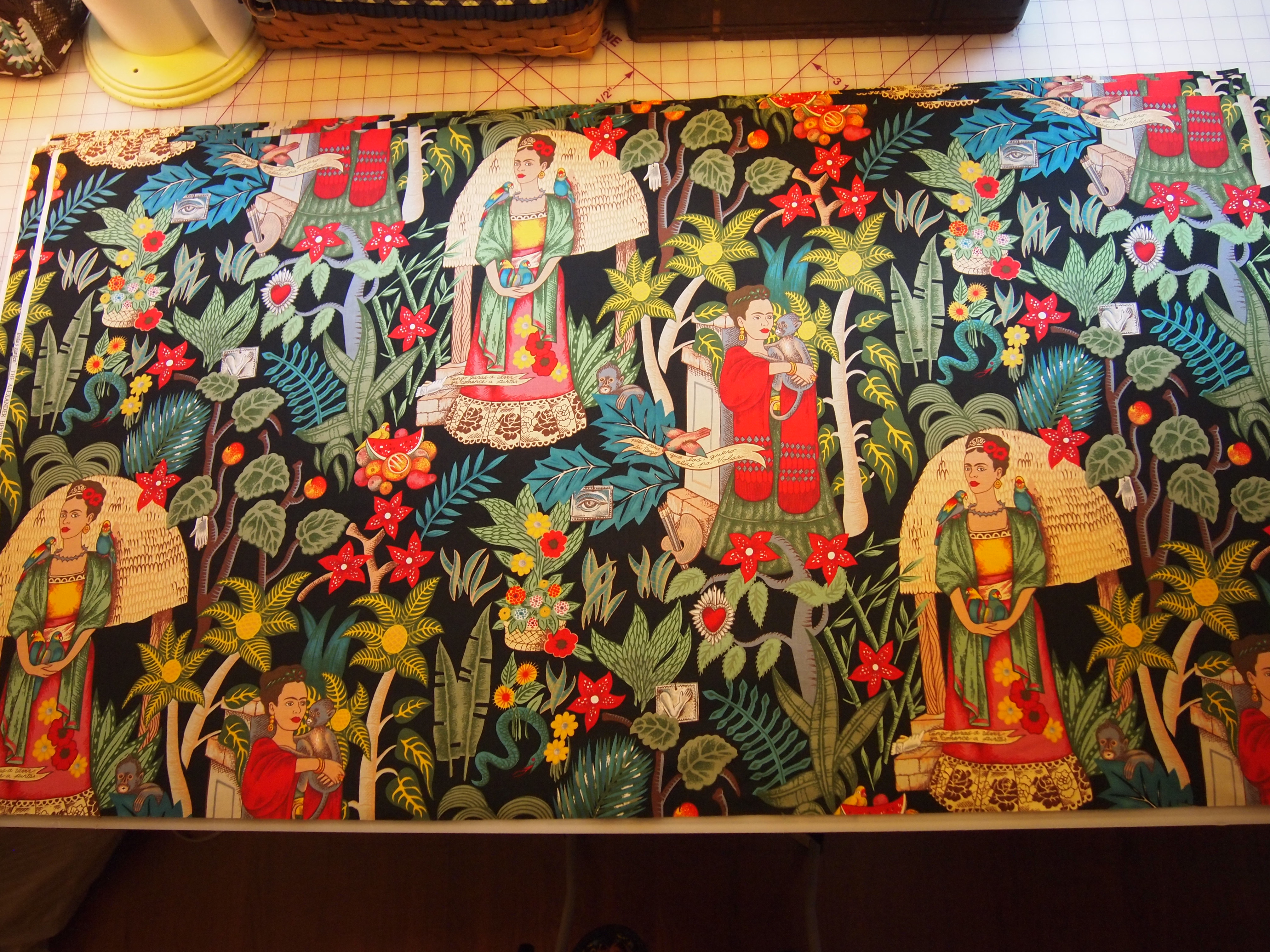 I’m working on my 52nd Hexagon Quilt. This one is cut from Alexander Henry’s fabric “Frida’s Garden” for Frida Kahlo, a Mexican Artist born July 6, 1907, died July 13, 1954. Below is one repeat of the fabric.
