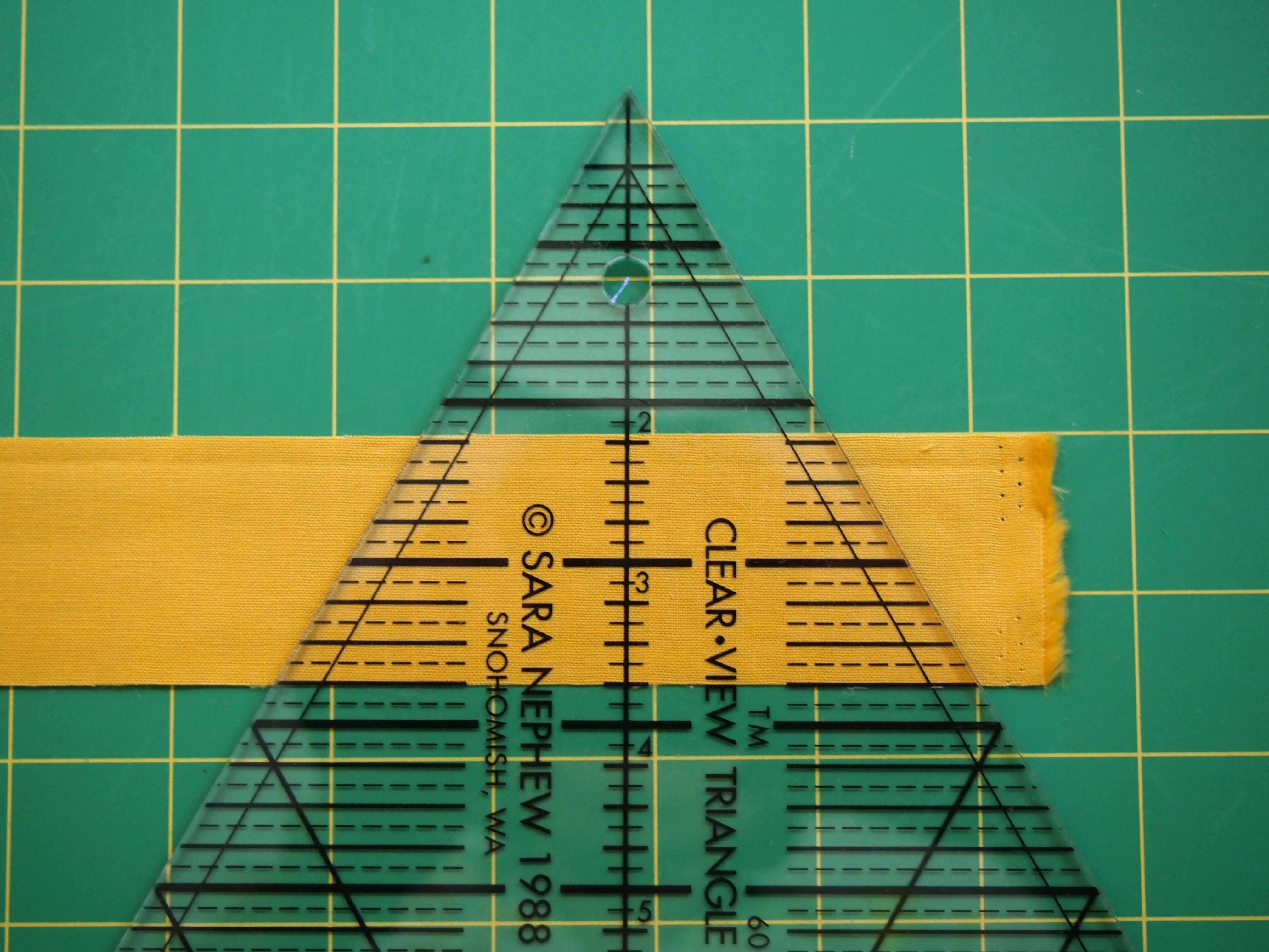 Align the 2 ¾” line on the Clearview rule along the bottom edge of the assembled strip, and cut along both sides. Note again that the point is missing.