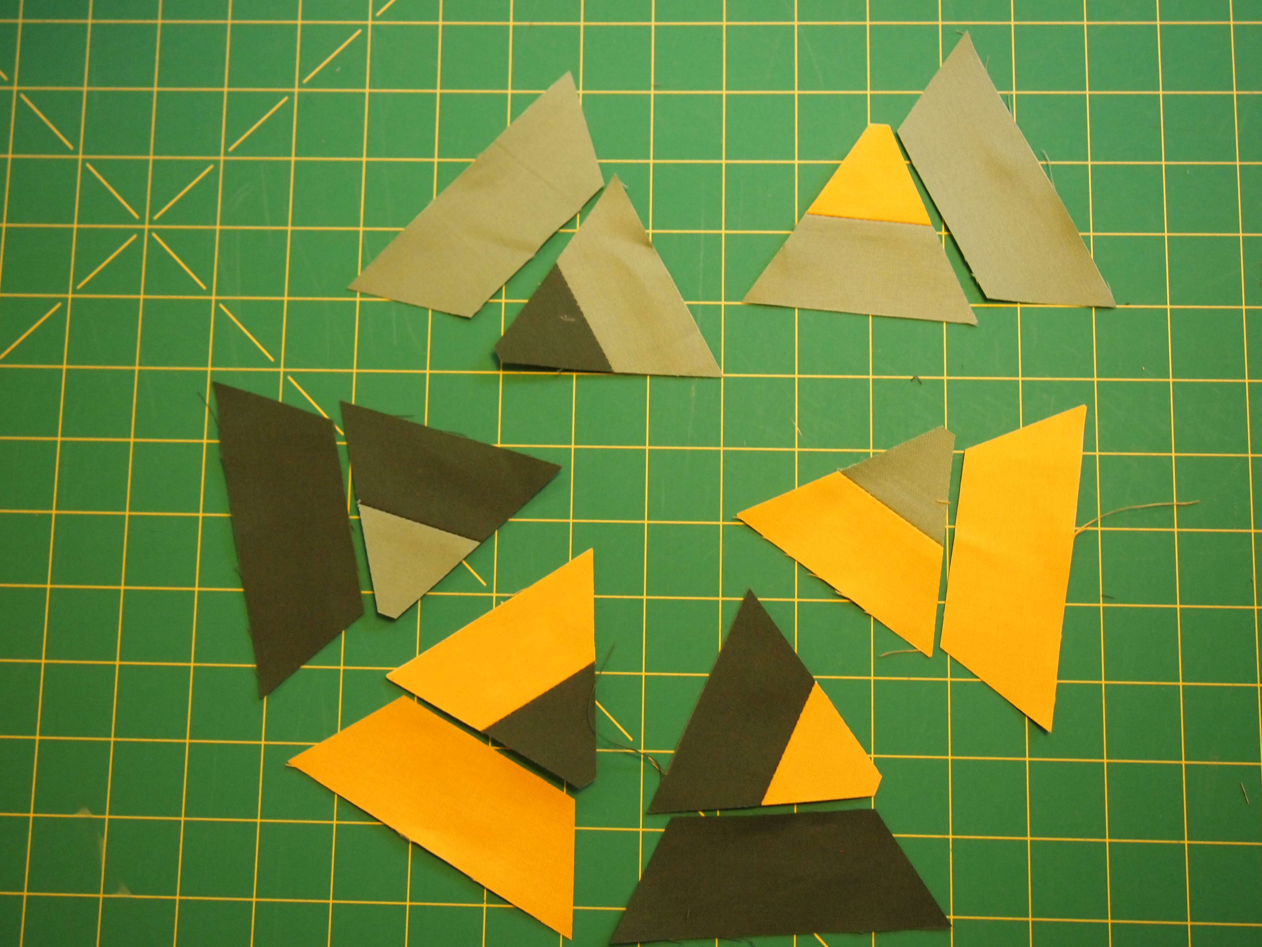 Sew a trapezoid to every 2 ¾” triangle, matching the color of the trapezoid to create a V triangle.