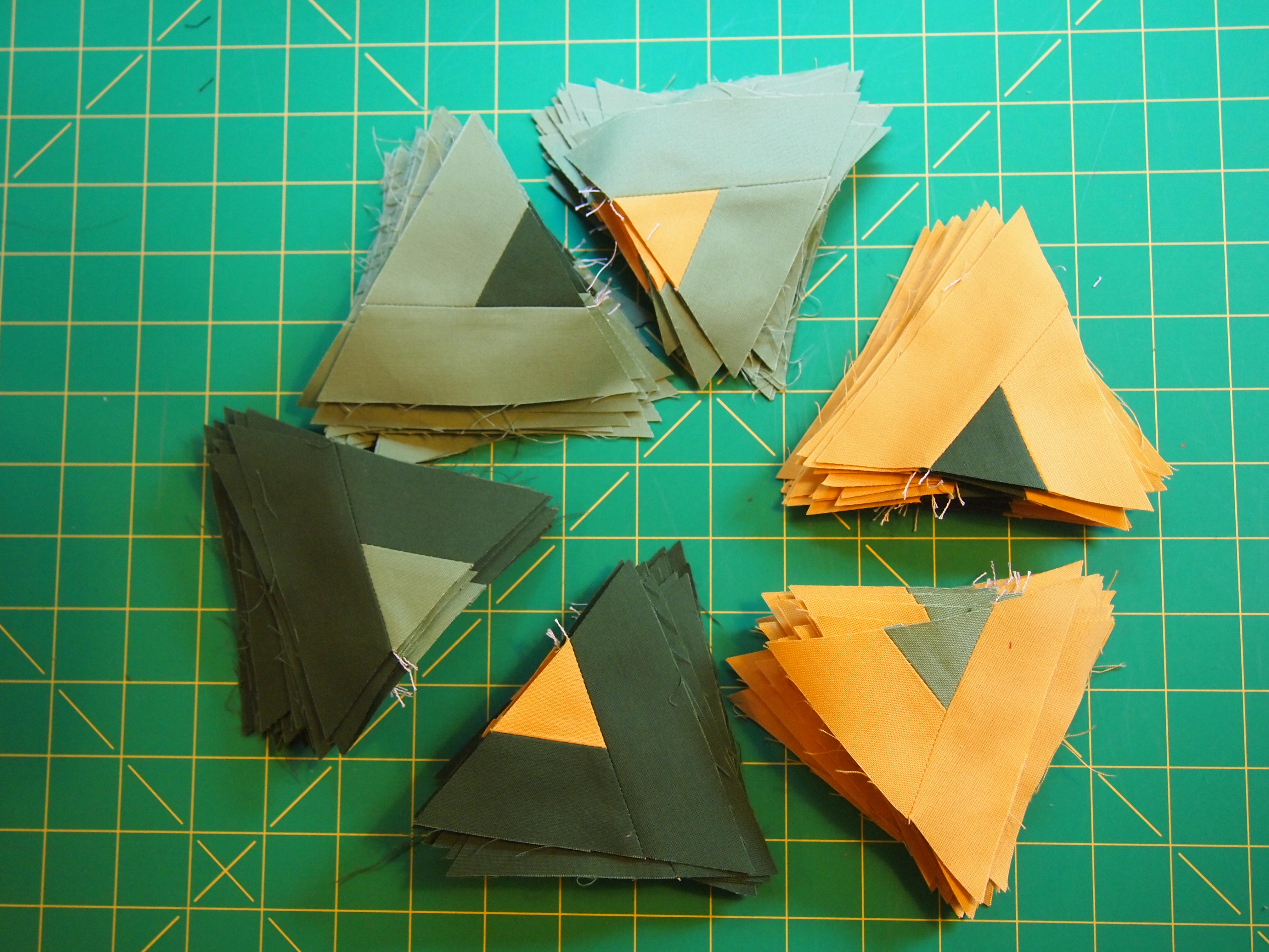 Striped Triangles – Sew the strips into 6 sets of 3 fabrics each as follows: