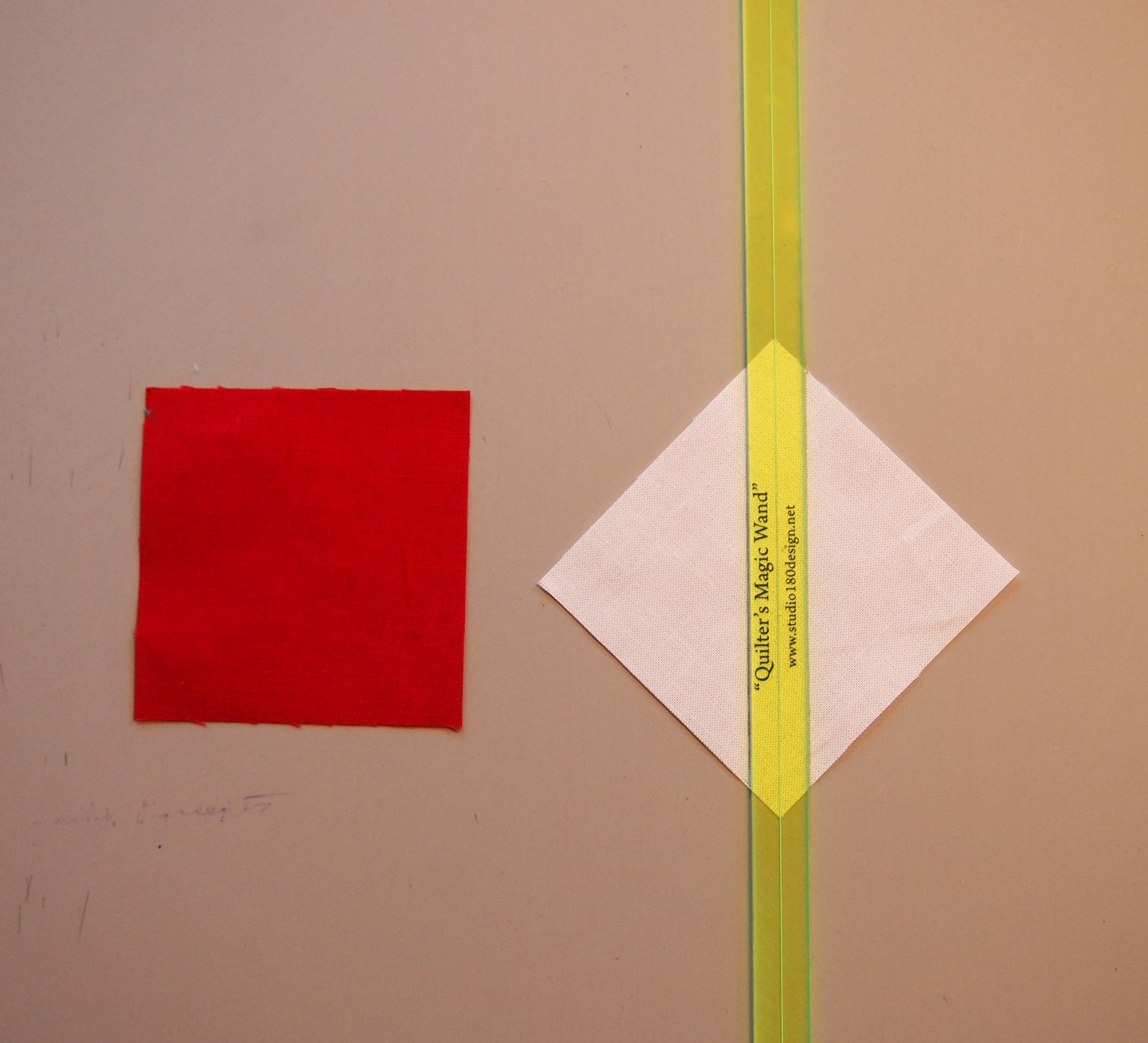 Place two 3” squares diagonally on the white 5 ½” square as shown.