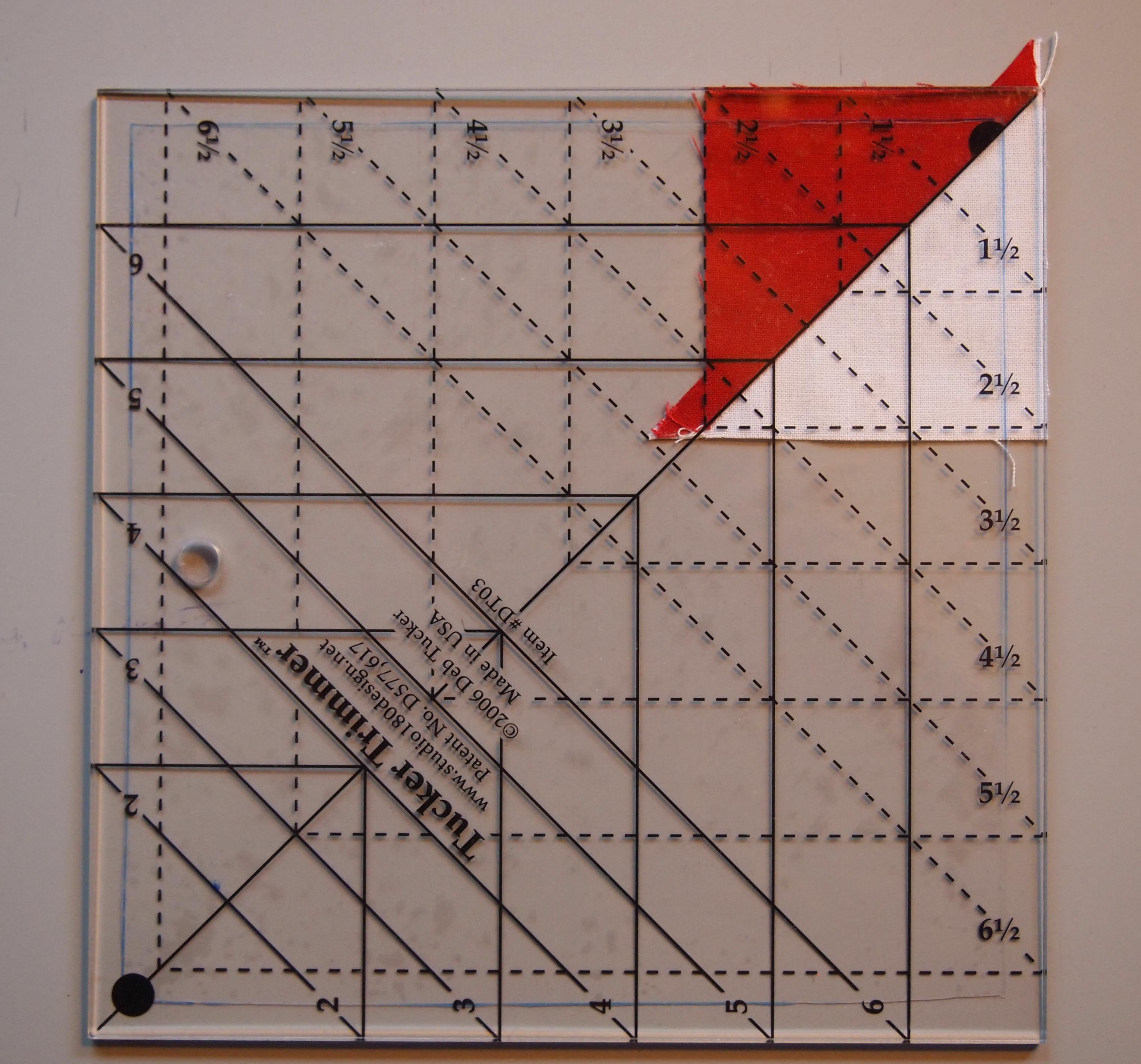 I needed 20 red and white Half Square Triangles (HST). Once again I consulted the chart on my Tucker Trimmer instructions. To end up with twenty 2 ½” unfinished HST, I cut 10 red 3″ squares and 10 white 3” squares.