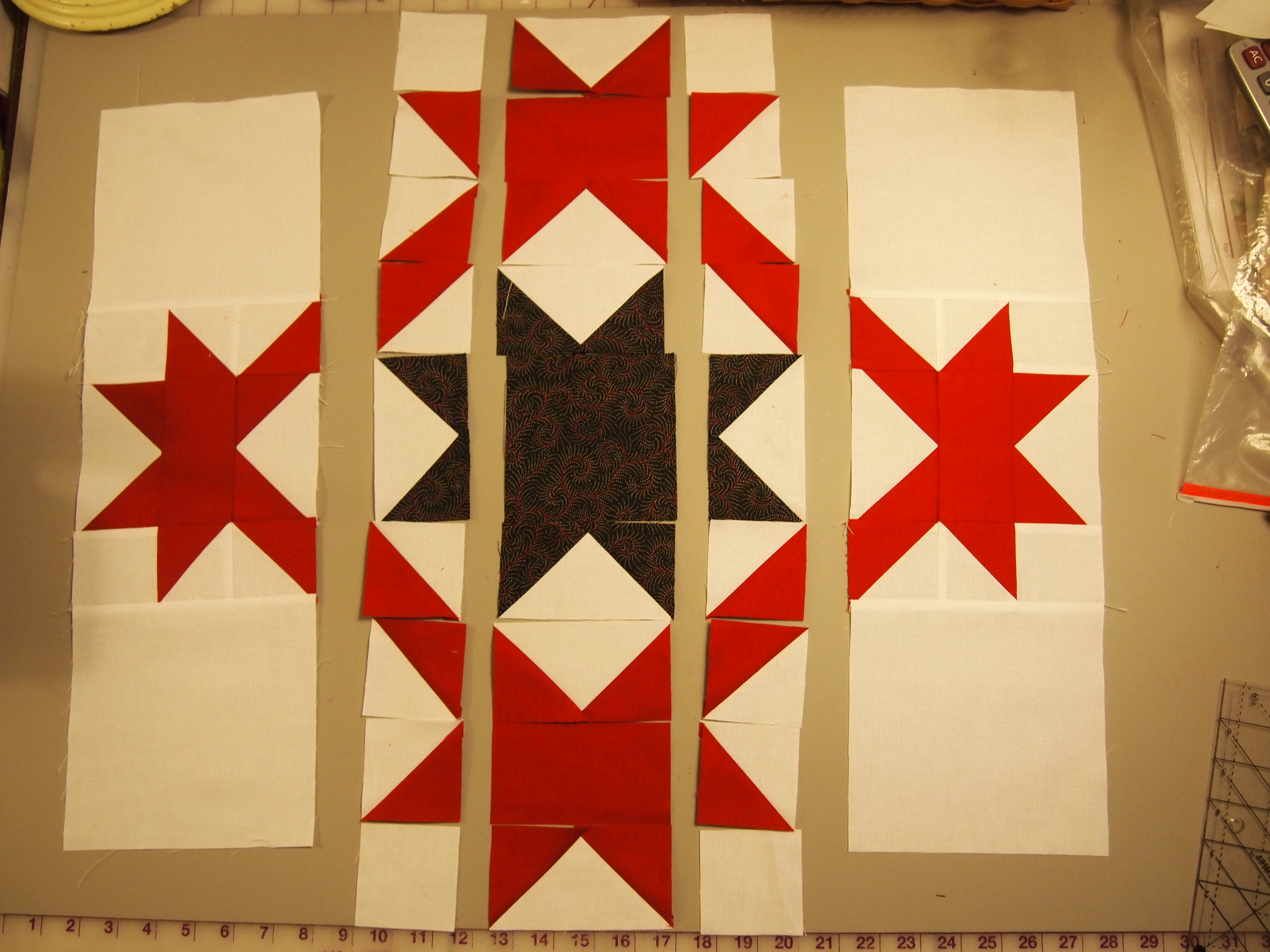 To make a 20” finished block I determined that each square on the graph paper would represent a 2” square. I chose a black print for the center star, white background and red for the surrounding units.