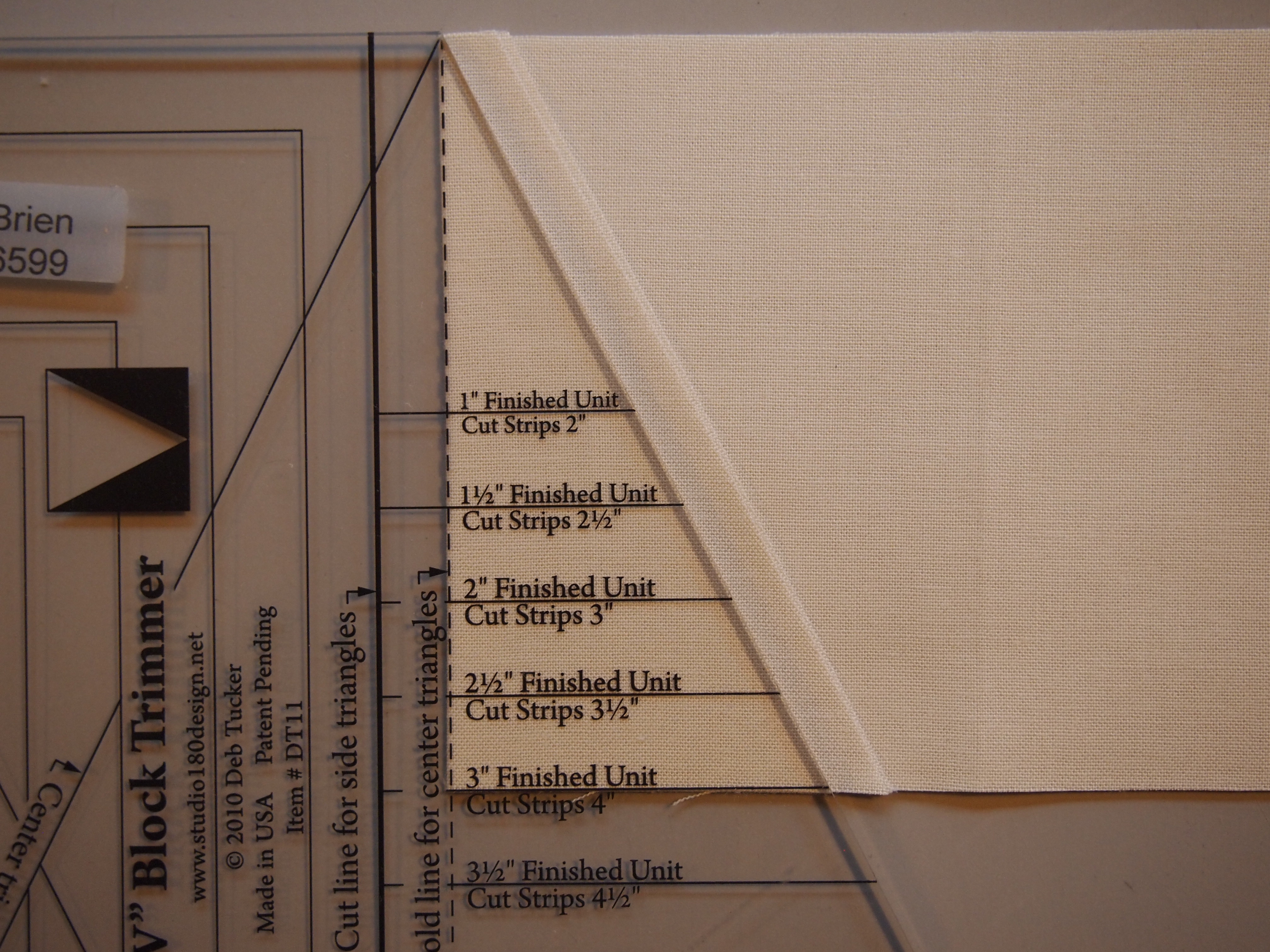 V Block Center triangle first cut. Fold the fabric strip deep enough to accommodate the slanted cut for the chosen size unit, trim.