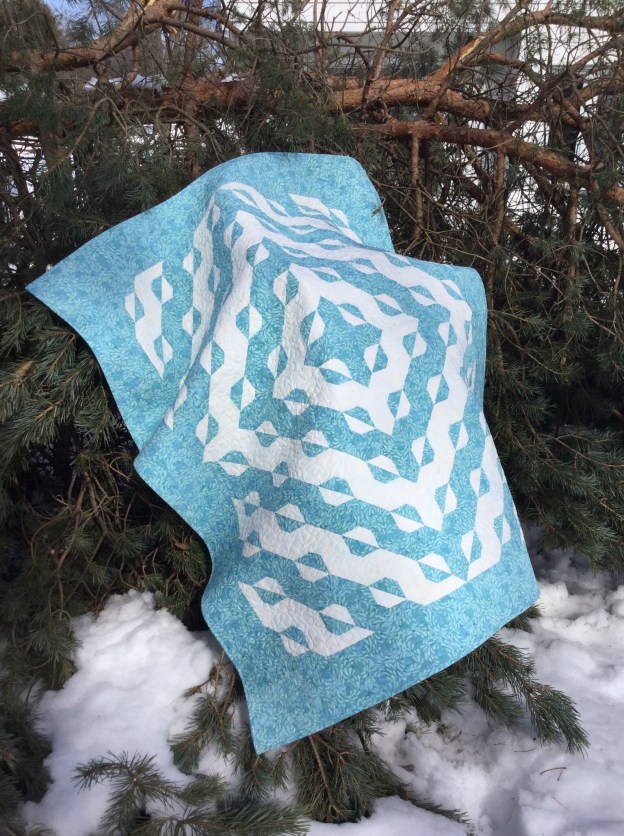 I chose “Baths of Tortola”, designed & pieced by Studio 180 Design Certified Instructor Heidi Chase (Running With Scissors Quilters).  Heidi’s quilt is a queen size, 8 x 10 block layout, made with the Large Hunter Star tool & 9″ finished blocks.  (The photo on the left of my smaller version of Baths of Tortola (50″x60″) was taken on one of the many trees we lost during one of the many nor’easters this winter.)