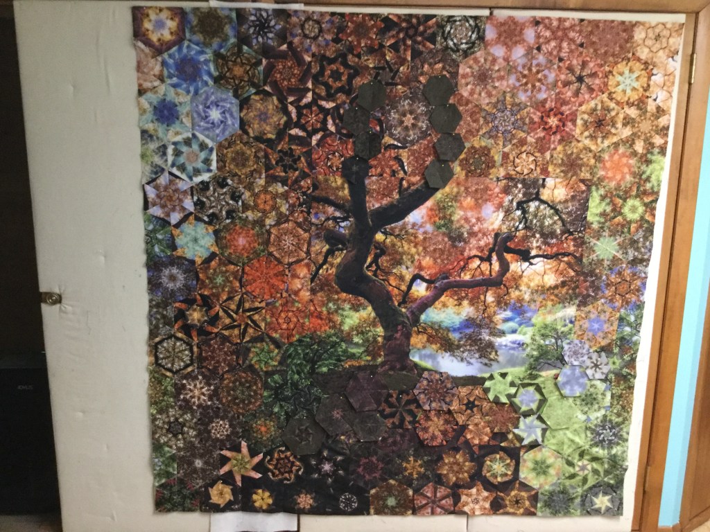 When I stitched the rows together, I discovered I needed to add some fabric so the hexies would line up as I wanted them to. Then I had to disguise the added fabric and soften the edges.