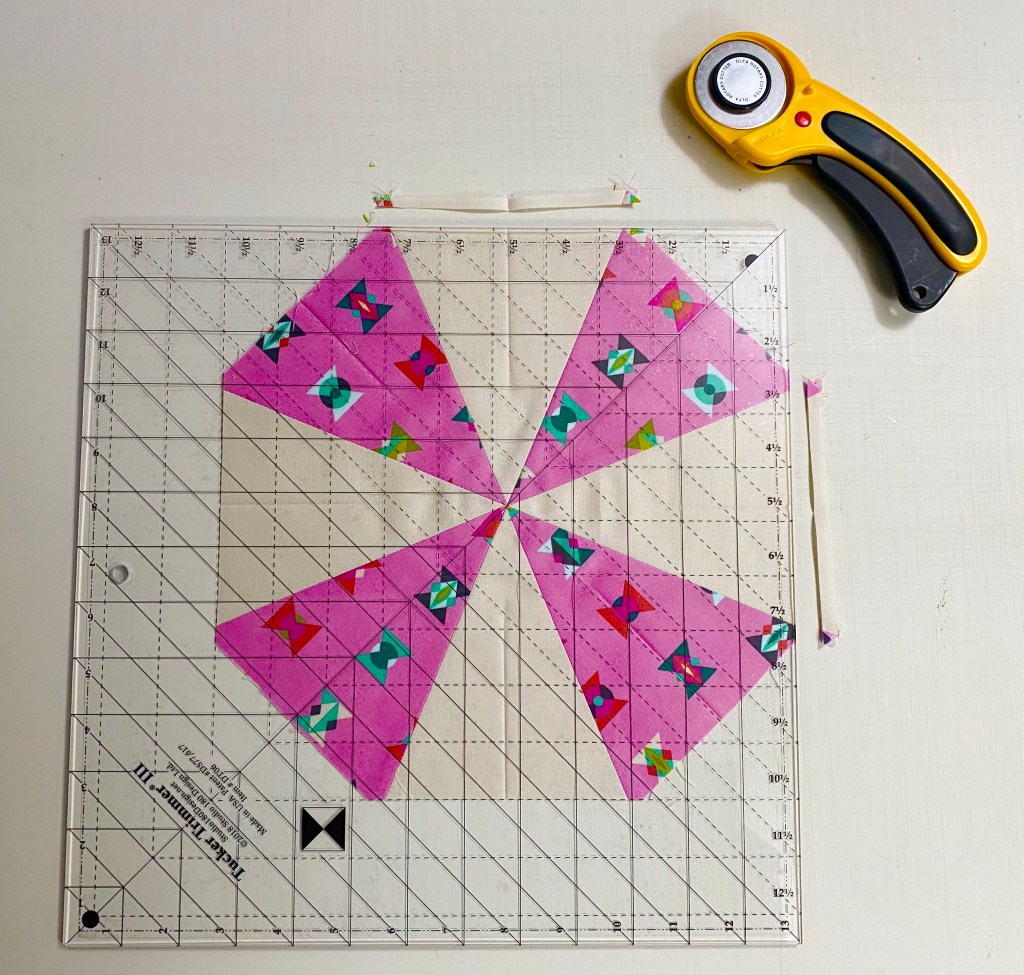 Using your Tucker Trimmer III, align the common diagonal and the 10 1/2″ sizing line with the registration marks and lines intersecting over the center of the block, trim up the side and across the top. Rotate the block and trim again.