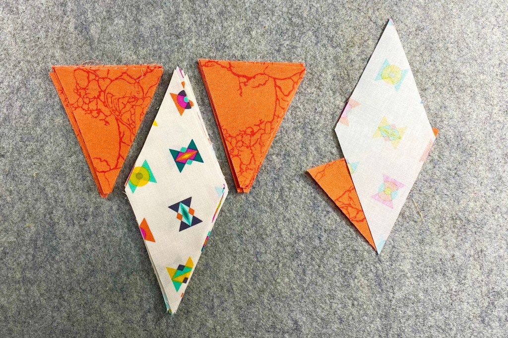 Lay out your small wedges and diamond units as shown. Position a small wedge from the right hand side of the top of the diamond. Match the point of the diamond with the corner of the wedge and align the raw edges.