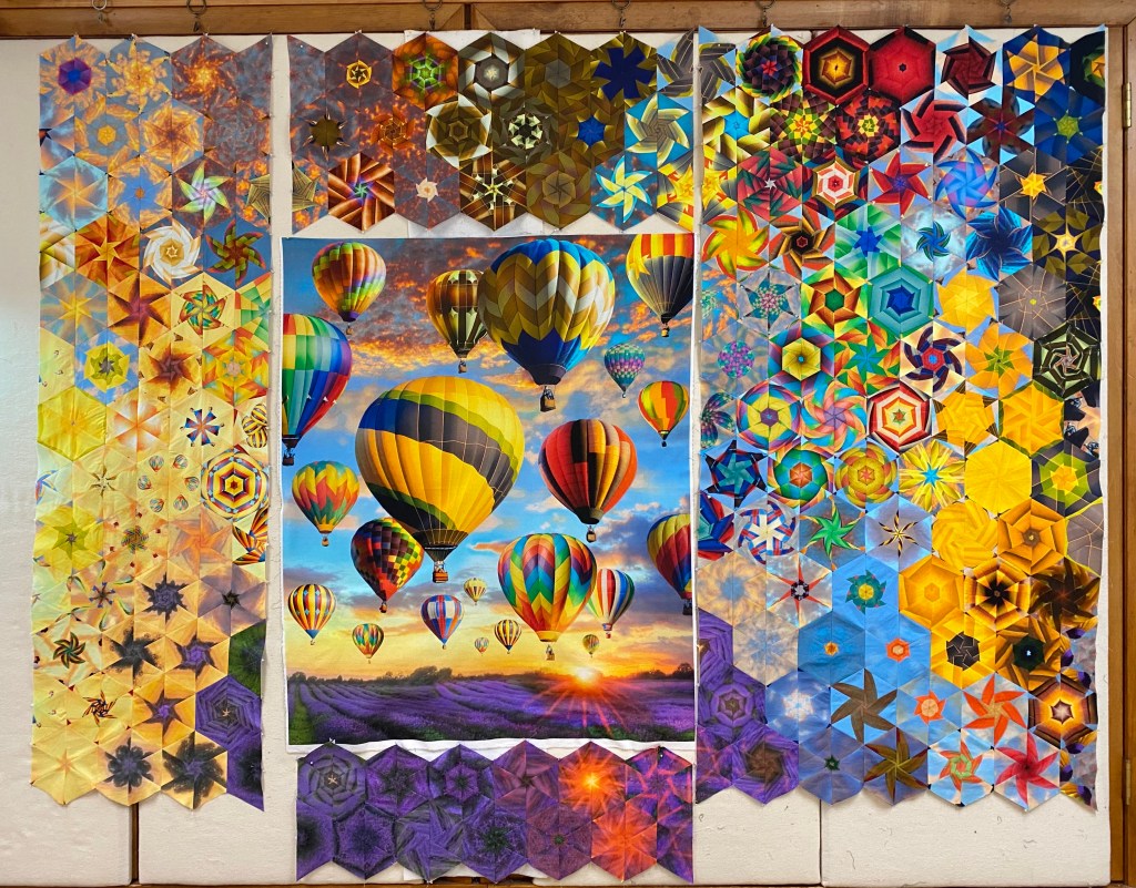 I will mark where the top hexies hits the top of the panel, add a 1/4″ seam allowance, trim the hexies and stitch to the top of the panel. I decided to trim the hexies because I did not want to cover the balloons.