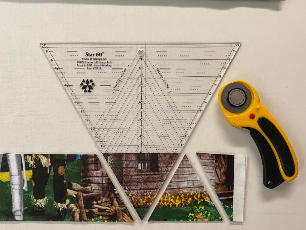 I used my Star 60 Tool from Studio Design to cut my equilateral triangles. Be sure the tool point just touches the cut edge of the strips. we want dogears to help lining up blocks and rows.
