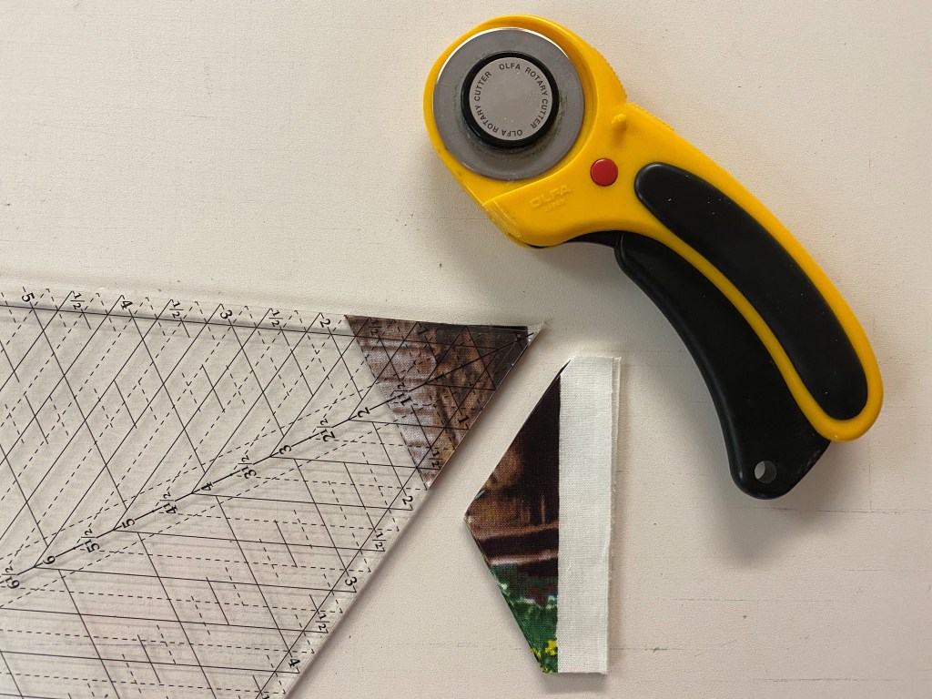 Cutting the Side Triangles.: Checking the chart for Side Triangle Strip size, I cut my 2 1/4″ WOF strips. Align the mark near the top of the tool with the top of the strip and the horizontal line on the tool that corresponds to the width if the strip (2 1/4″). Cut the side triangles then rotate the tool and cut again. Each diamond will need two side triangles. Follow the Star 60 tool instructions for Piecing the side triangles to the diamond.