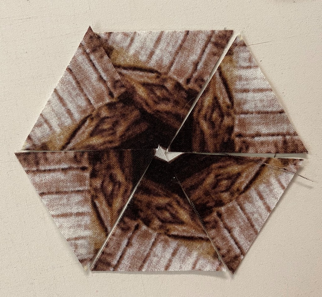 Pick up the first two right sides together, nudging the top half hexie 1/4″ from the point and stitch together. Press toward the first half hexie.