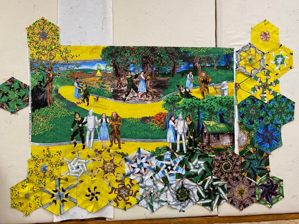 Placing the panel on the design wall takes some thought and planning. My design wall consists of 4 closet doors 24″ wide, that are covered with flannel over insulation, so I have plenty of room. My goal was to create a path that would connect the yellow brick road on the right side with the yellow brick road on the top of the panel. I placed the panel so there would be more room on the right side and the top of the panel.