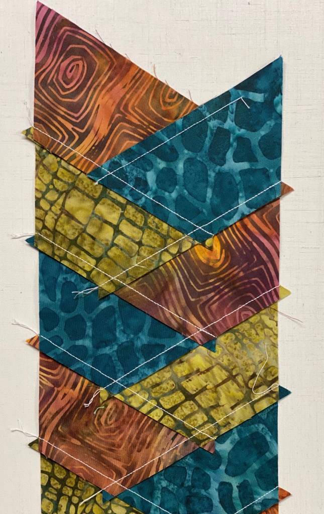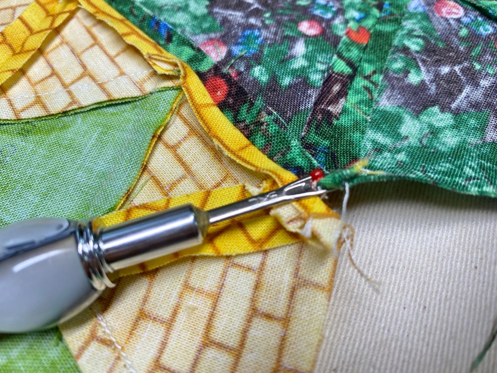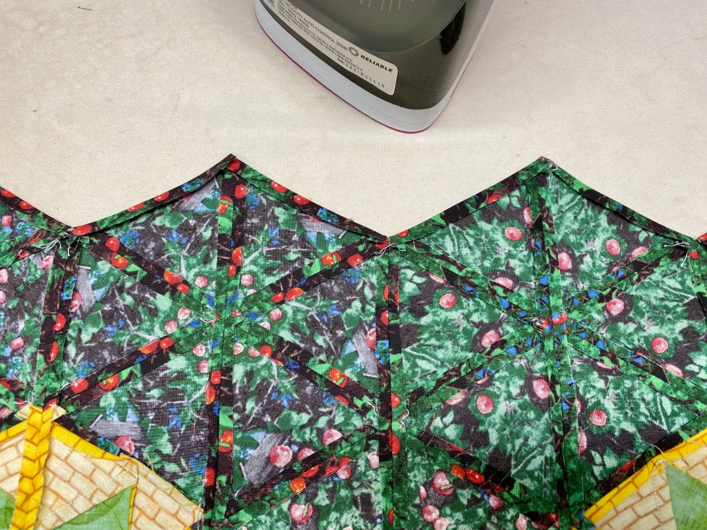 I decided to applique the top section to the panel by leaving the points on the bottom of the top section. I took stitches out about 1/4″ down between the valley of the blocks and pressed the edges under 1/4″.
