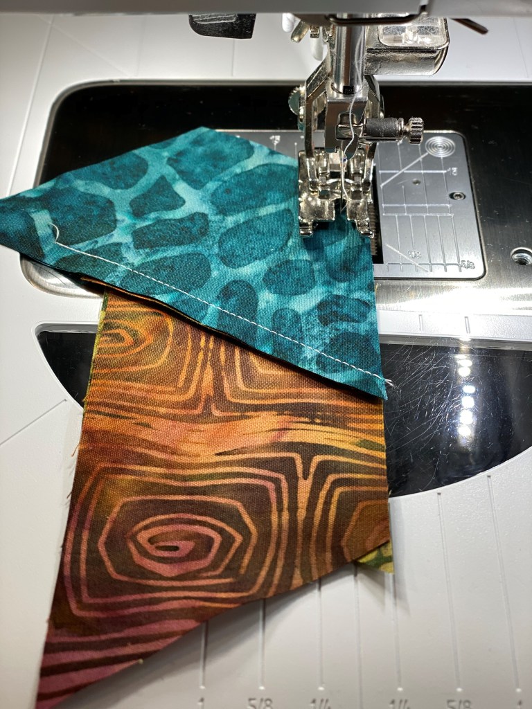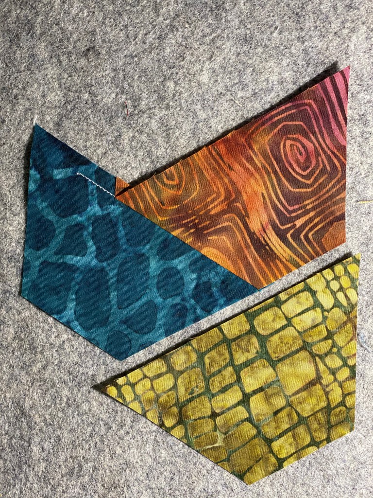 I decided to add the bottom section to panel first. I didn’t want to leave the points because they would cover up Toto, and I couldn’t have that, so I trimmed the top points only. I don’t trim the outside edges until the top is all stitched together.