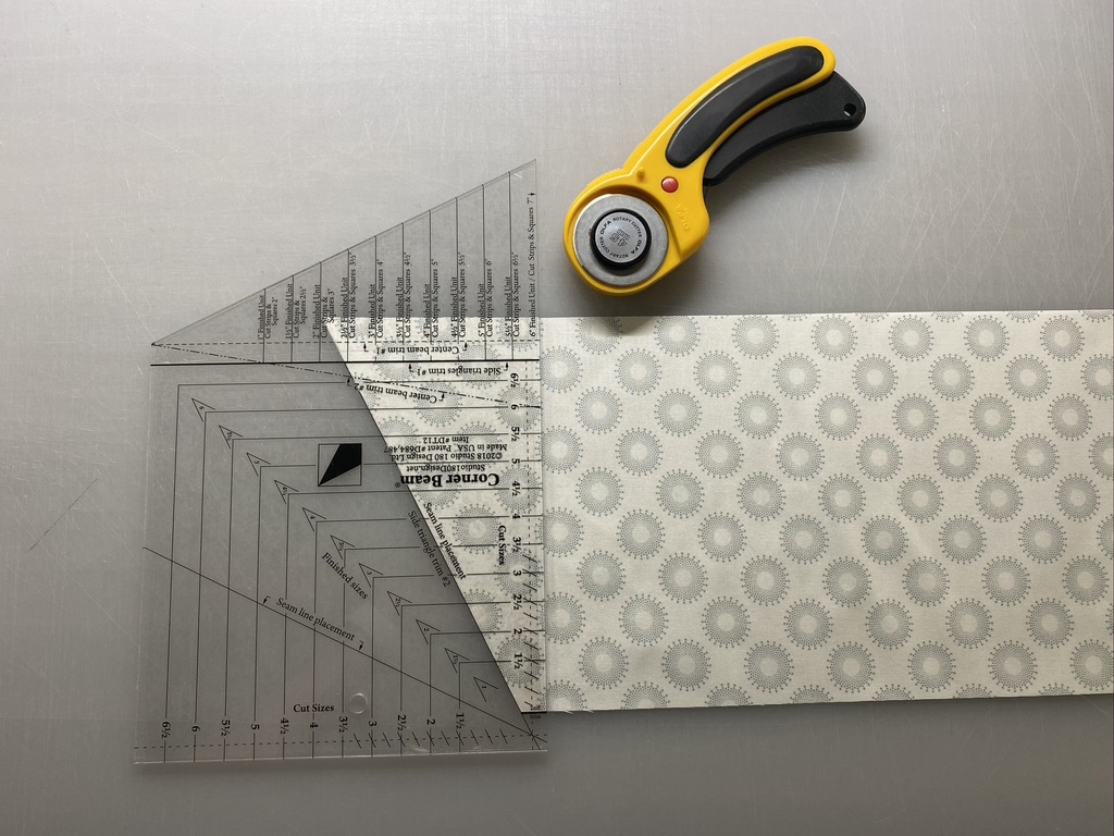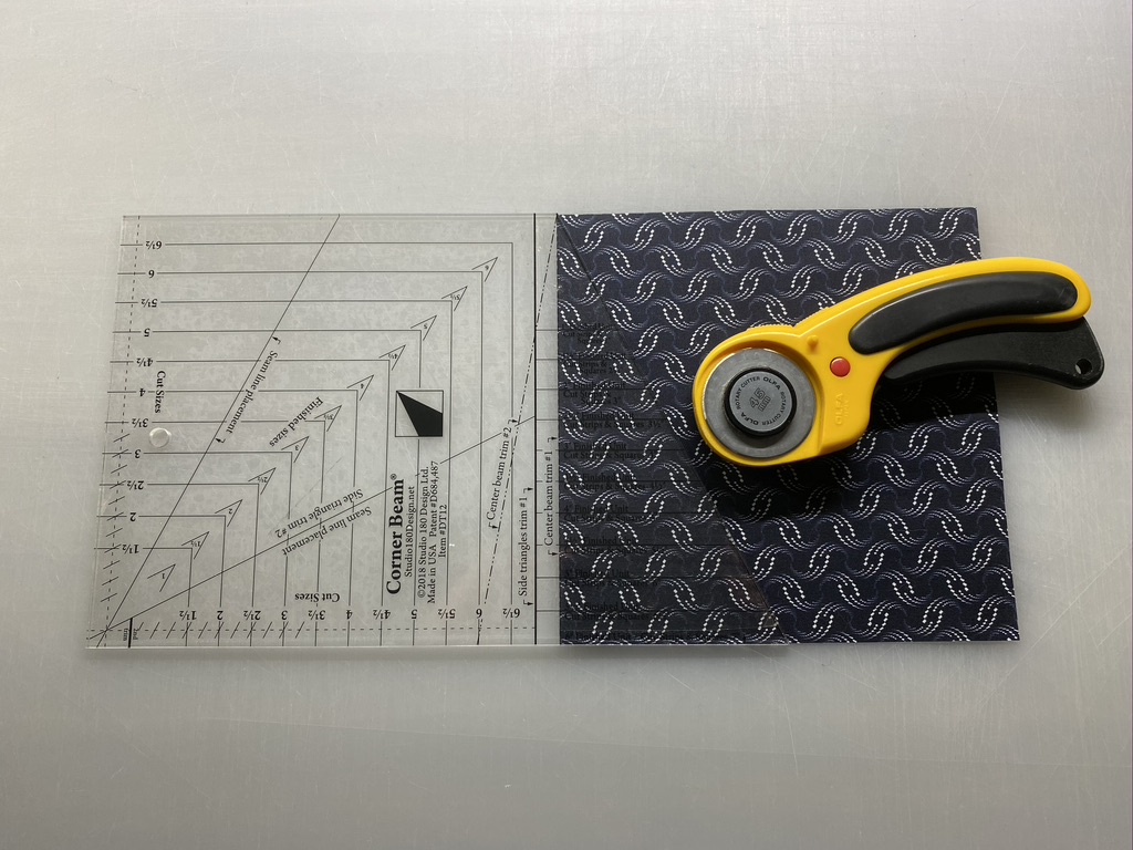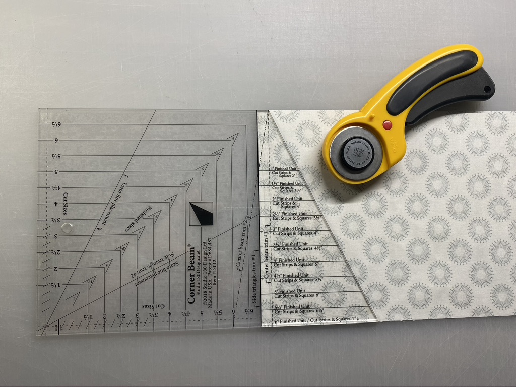Step 1 – Stack the 7” center beam squares up to 4 layers deep. Align the Center Beam Trim #1 line on your Corner Beam® tool and the 6” finished unit line (bottom edge of tool) with the raw edges of your stack of squares. Cut along the angled edge.