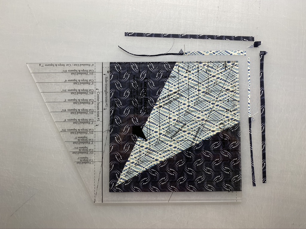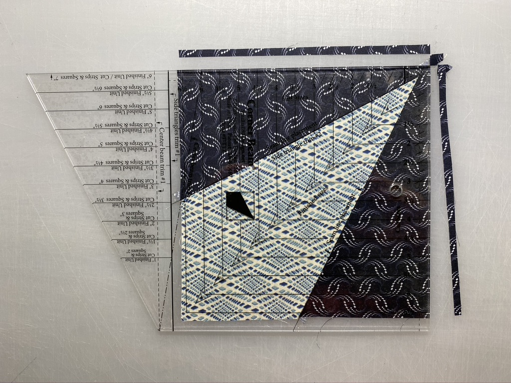 Step 9 – Rotate your unit. Align the cleanup lines for the 6½” cut size with the cut edges, the V shaped guideline with the seam intersection, and the tick marks with the seams at the wide end of the beam. Trim. Repeat for all units. Label as indicated in the Unit Summary.