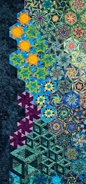 I created a barrier reef for my mermaid using Studio 180 Design’s Star 60 tool, along with Quad 60, Framed 60, Capped 60, Checkerboard 60 & Hollow Cube 60 (not yet released) Technique sheets. My Island Batik stash is like having the BIG box of crayons. They are my go-to batiks to add color and interest to my OBW’s and all my quilts.