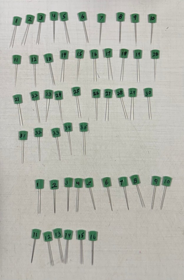 The Flathead Magic Pins come in a 50 pack. That makes them PERFECT to number each pin and use them to identify each column. It’s wonderful to not need to have to number little pieces of paper every time I design a OBW.