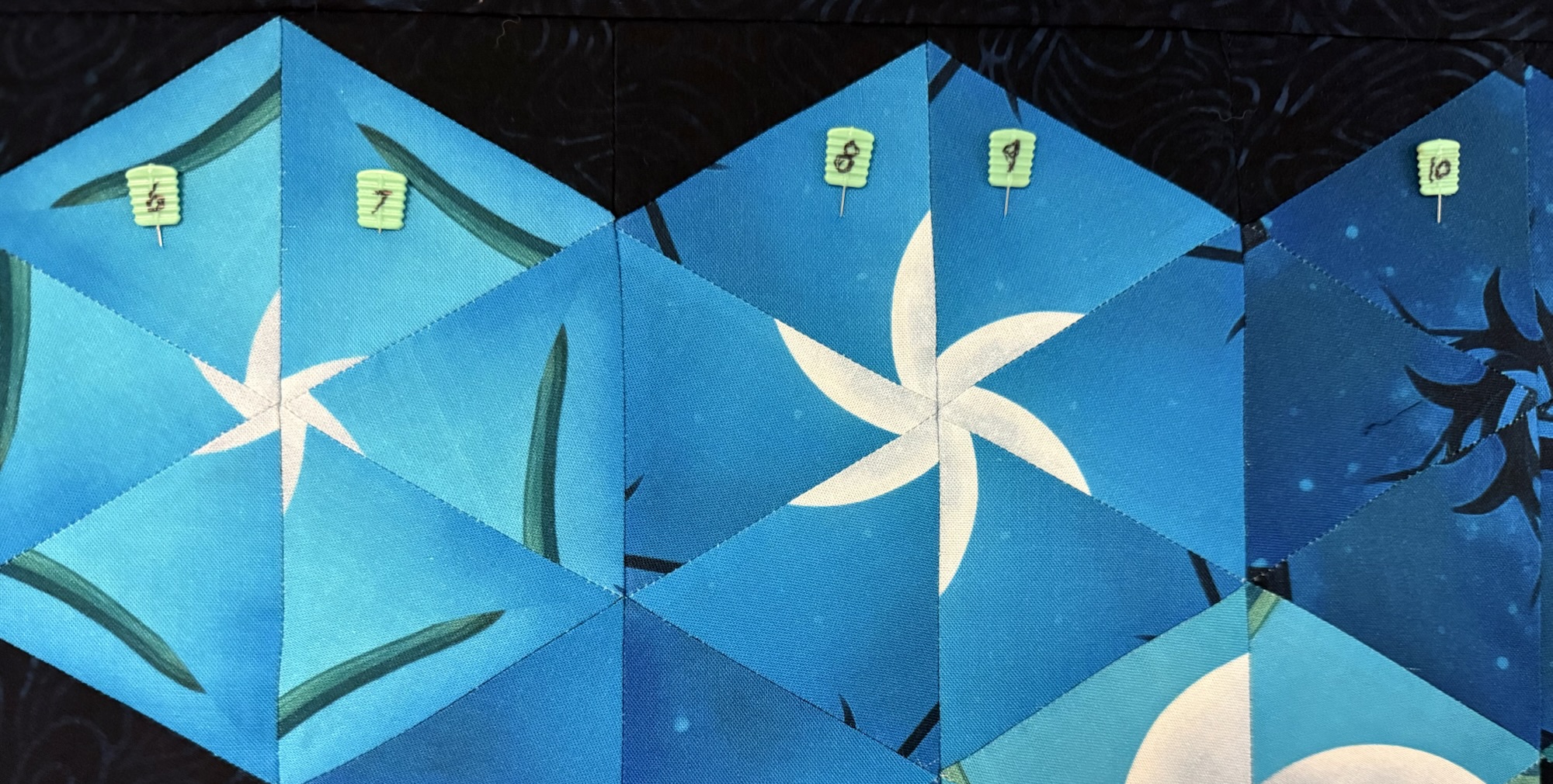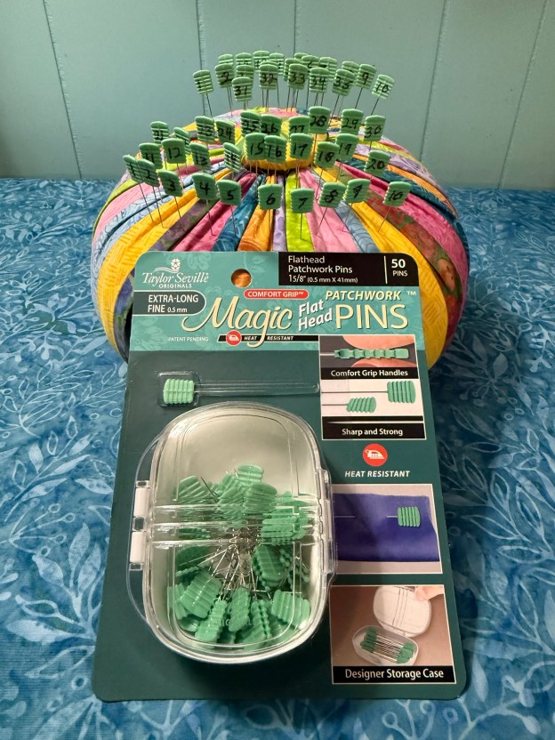 Magic pins have these great Flathead pins in Applique, Patchwork, Quilting, Alphabet and Extra Long. My OBW’s vary in size. On average, I have about 30 columns across the quilt with another 15 on the bottom section under the panel.