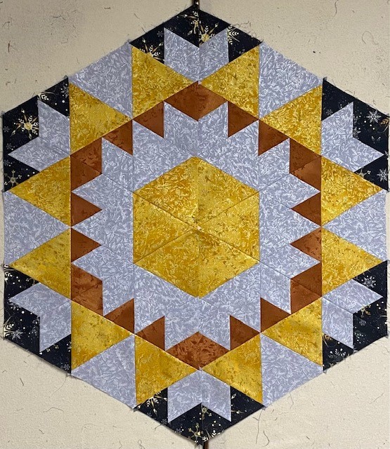 It is fun to see the differences. With the first “Creepin It Real” I cut my strips 3.75″ for 6″ finished hexies. With “Creepin It Real 2″, I cut my strips 3.25″ for 5” finished hexies. That gave me 31 more hexies than I had with the first one. The first “Creepin It Real” measures 90″ x 70″. The second “Creepin it Real” measures 74″ x 74″. Even though I had extra hexies, I did not use them all.