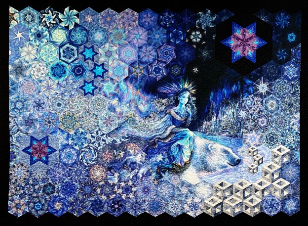 It is fun to see the differences. With the first “Creepin It Real” I cut my strips 3.75″ for 6″ finished hexies. With “Creepin It Real 2″, I cut my strips 3.25″ for 5” finished hexies. That gave me 31 more hexies than I had with the first one. The first “Creepin It Real” measures 90″ x 70″. The second “Creepin it Real” measures 74″ x 74″. Even though I had extra hexies, I did not use them all.