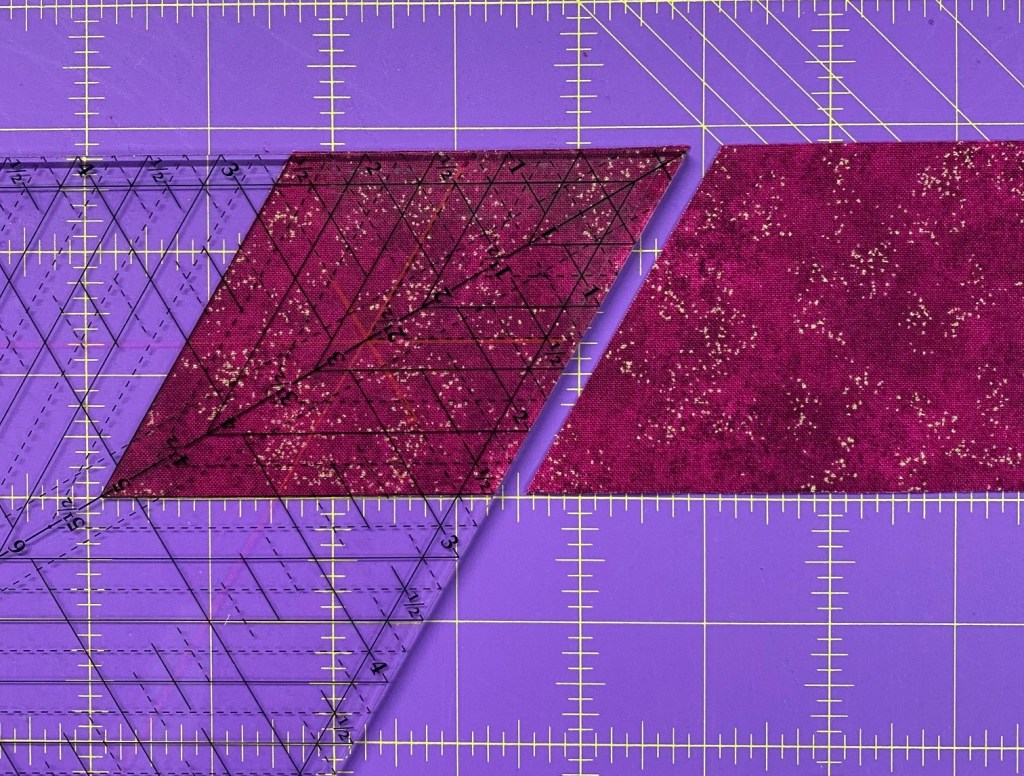 Take the 3 Star 60 units that are pointing outward and position them so the raw edge with both side triangles is either by your right hand if you are right handed or left hand if you are left handed. Locate and align the Flat Edge trim lines on the tool with the seams of the diamond and trim.