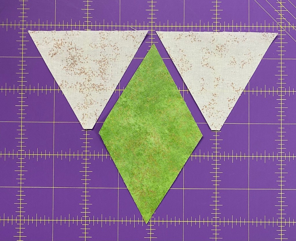 Position a remaining triangle on the other side of the diamond point. Align the flat corner of the triangle with the edge of the diamond. Align the raw edges. With the diamond on top; stitch.