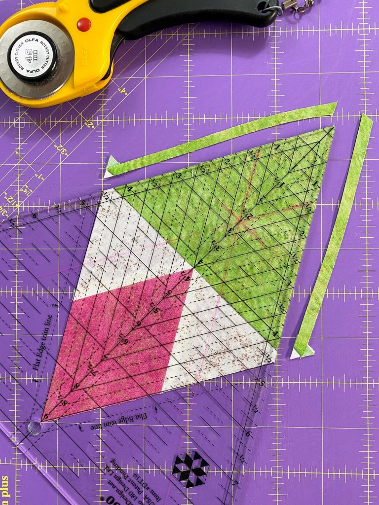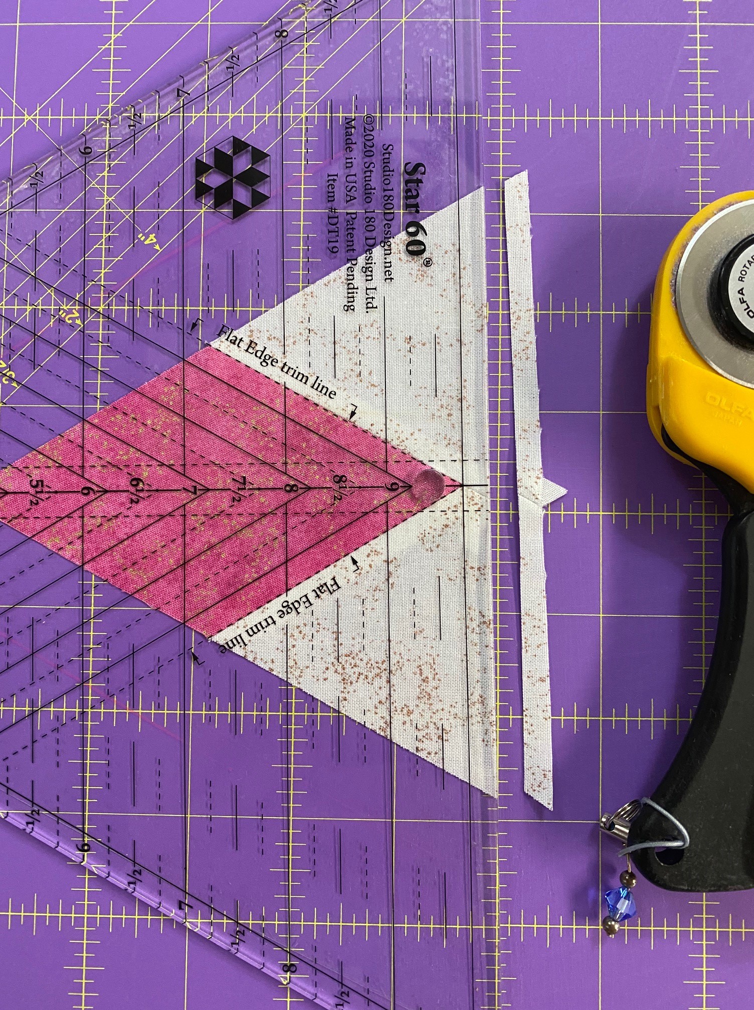 Trim the 3 remaining Star 60 units (they are pointing inward in the layout). Position the pieced unit right side up on the cutting mat. Align the 4″ Diamond Point Guidelines with the sewn seams. Trim along both sides of the tool.