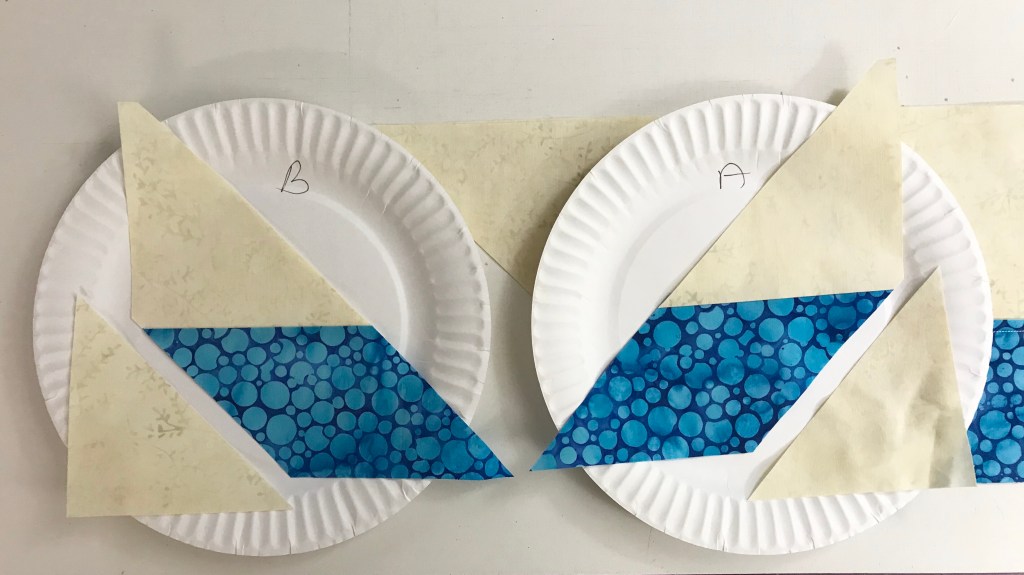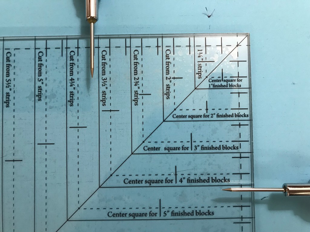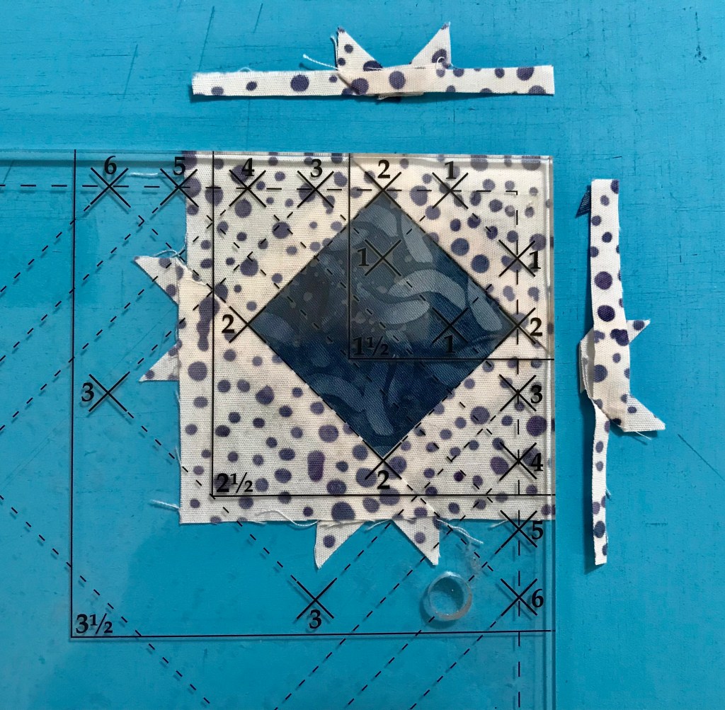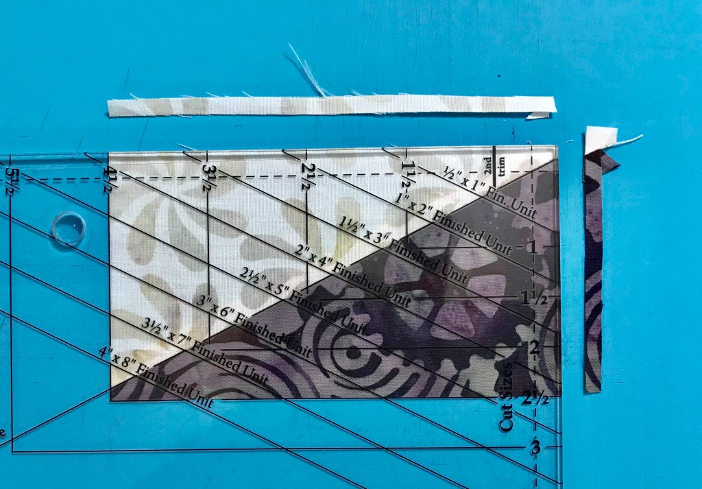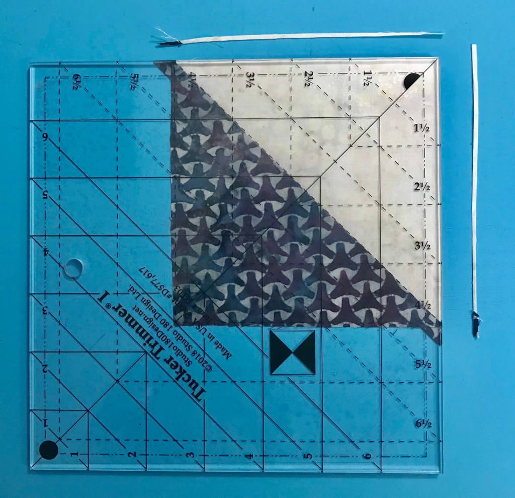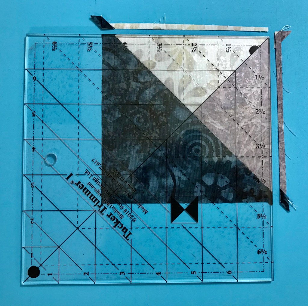 My tip for staying organized while making Lemoyne stars is to label two paper plates, one “A” & one “B”. Follow the Lemoyne star tool instructions. When you come to Step 7, make one 45 degree cut – then imediateley reposition your ruler to cut the side triangles as you go.