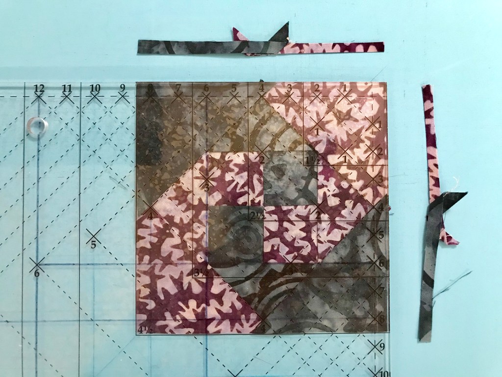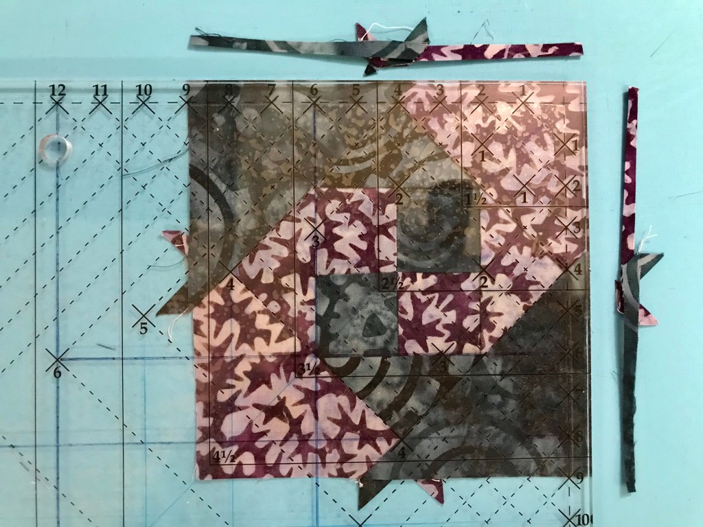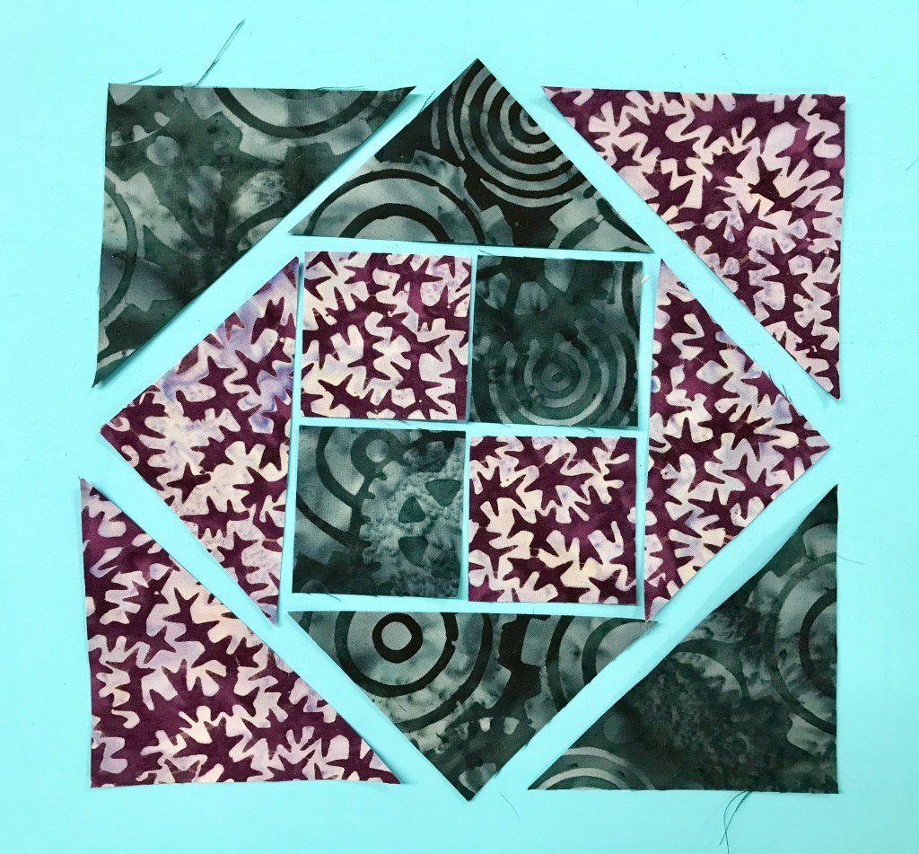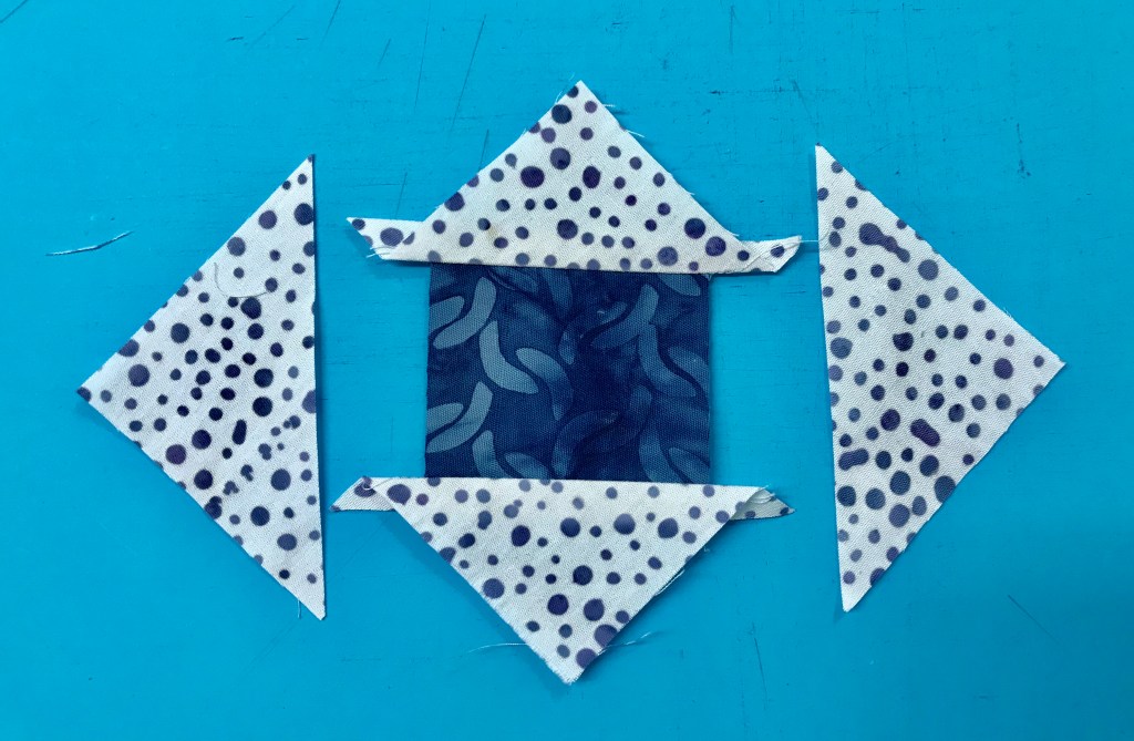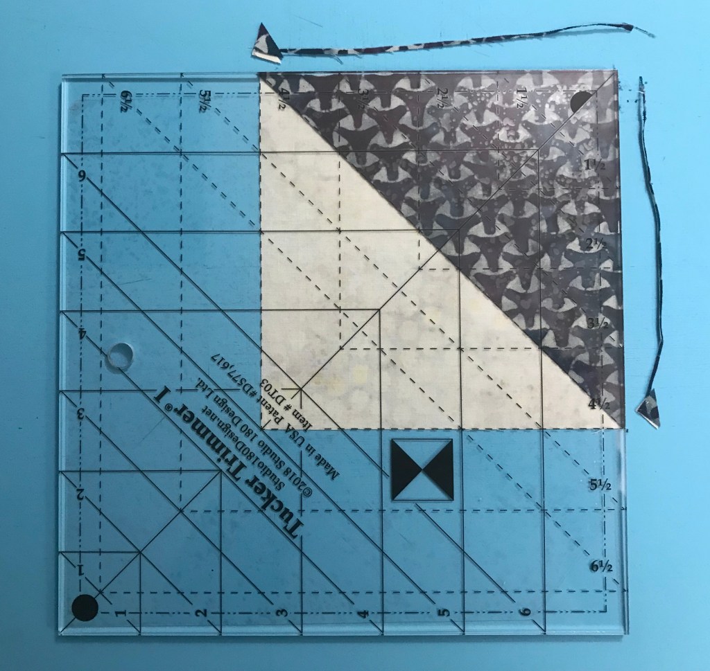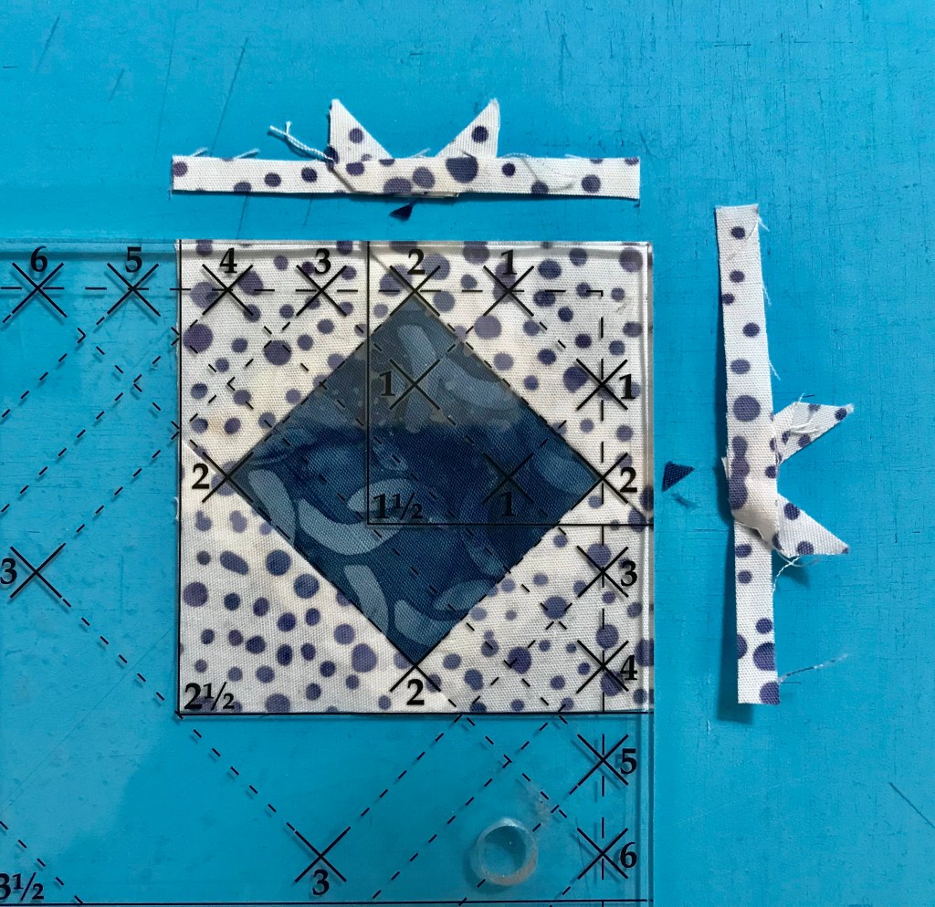 My tip for staying organized while making Lemoyne stars is to label two paper plates, one “A” & one “B”. Follow the Lemoyne star tool instructions. When you come to Step 7, make one 45 degree cut – then imediateley reposition your ruler to cut the side triangles as you go.