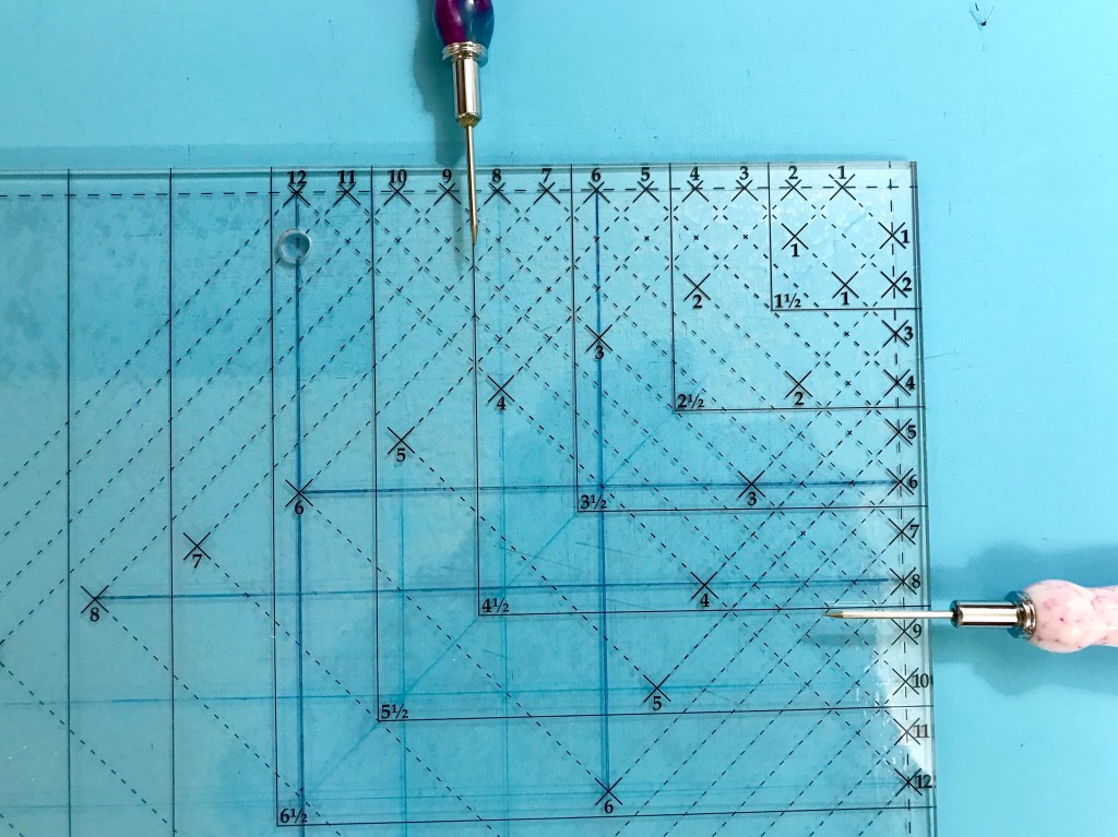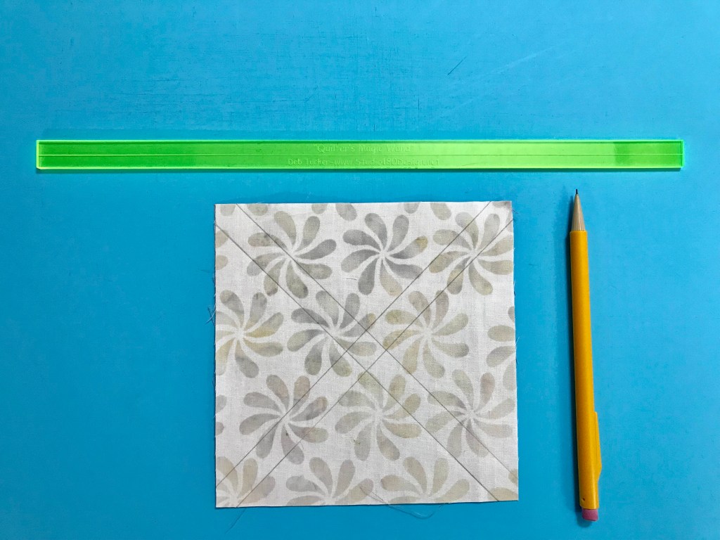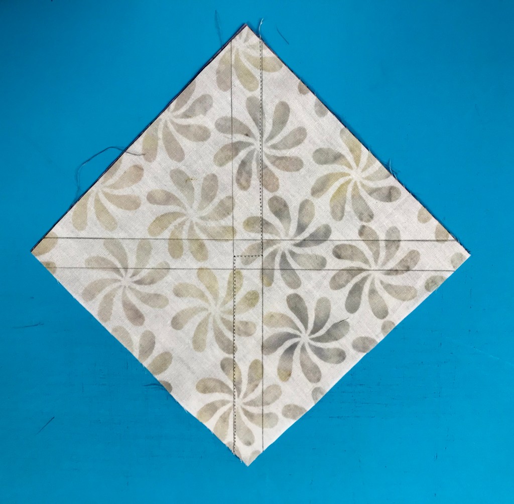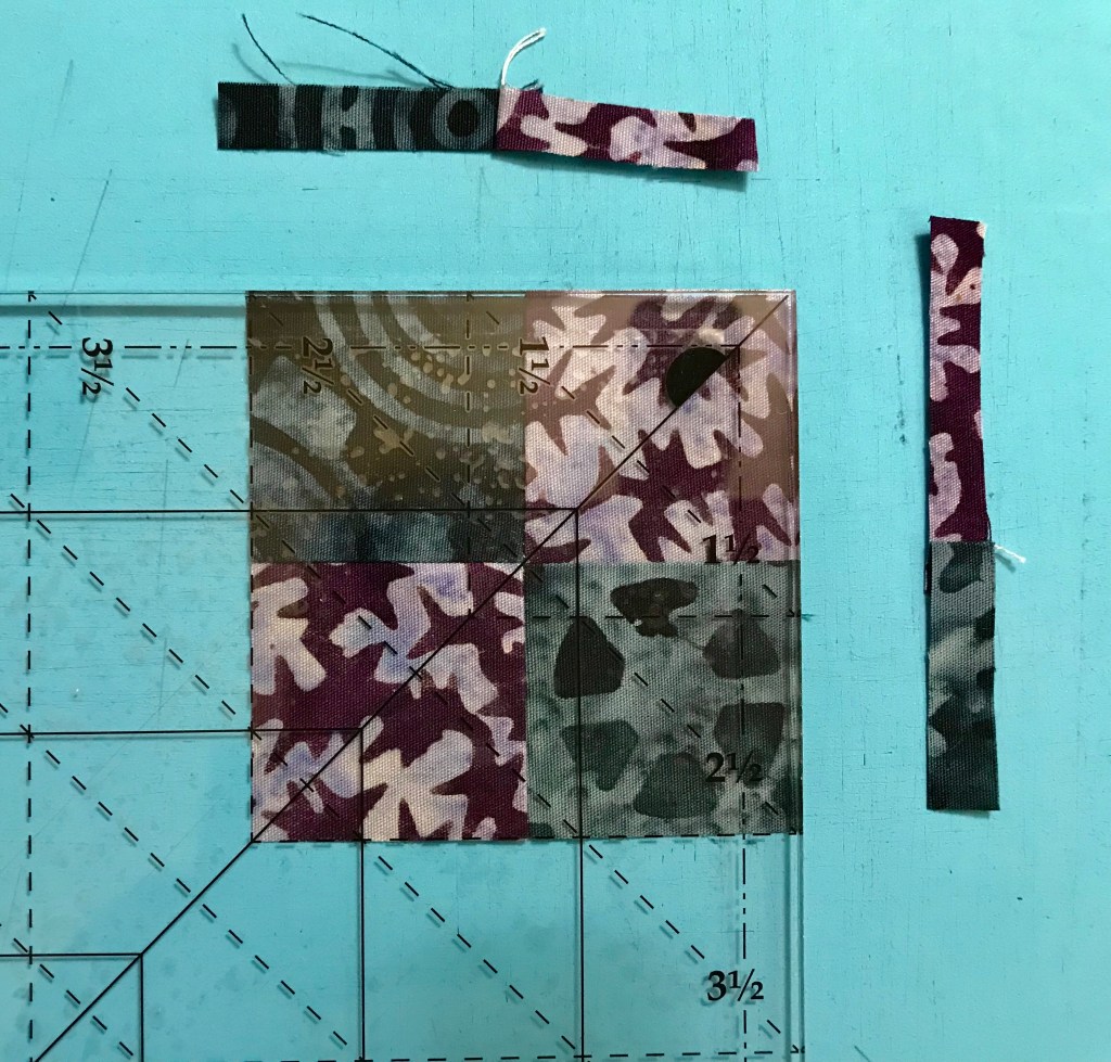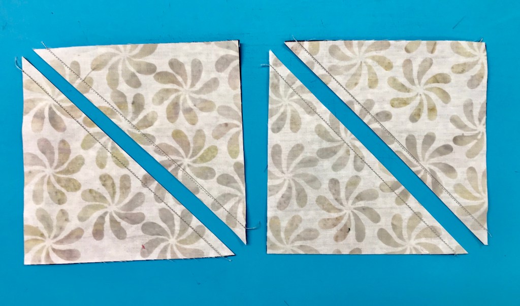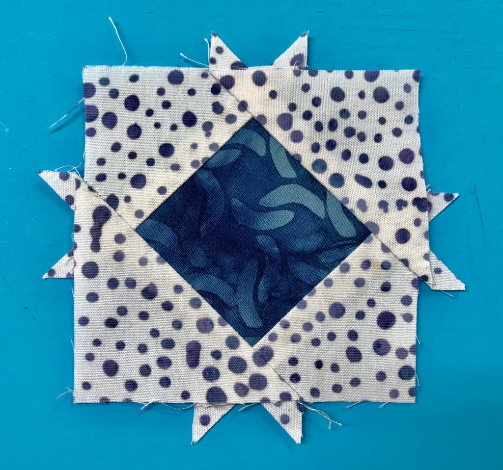 My tip for staying organized while making Lemoyne stars is to label two paper plates, one “A” & one “B”. Follow the Lemoyne star tool instructions. When you come to Step 7, make one 45 degree cut – then imediateley reposition your ruler to cut the side triangles as you go.