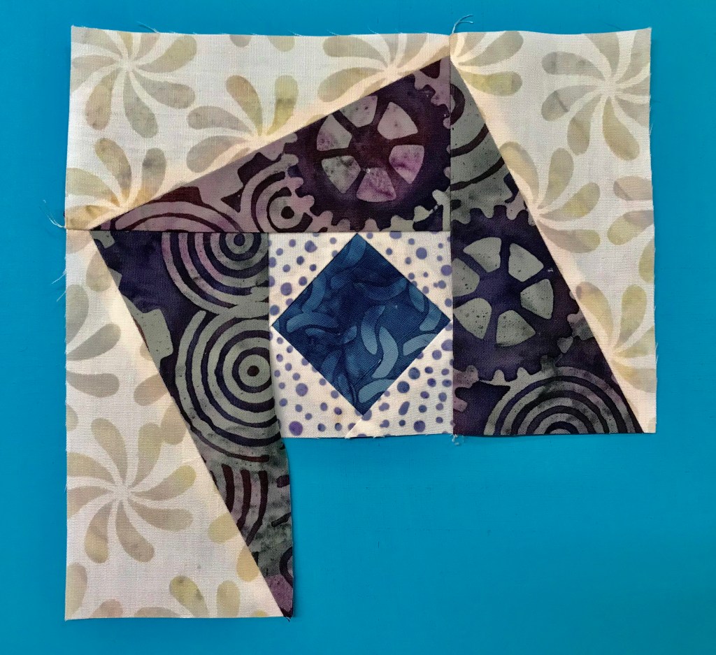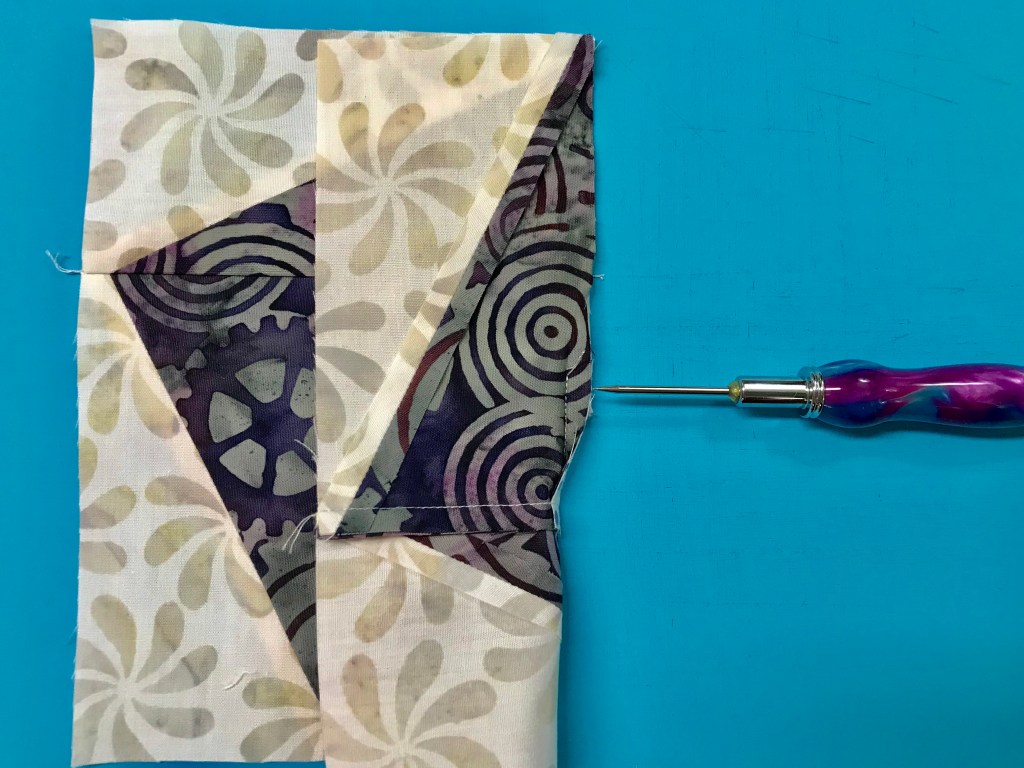 If you are right handed the “B” strip was on the bottom & the “A” strip was on top. Place the “A” unit on the plate marked “A” and the “B” unit on the plate marked “B”, place one triangle on each plate also. (If you are left handed the “A” strip would be on the bottom and the “B” strip would be on top). Continue cutting your units, placing each unit on their assigned plate. Construct the Lemoyne units as instructed. Throughout the process you will always know which units are “A” and which are “B”. This is important for knowing which way to press your seams. Another tip for pressing the lemoyne star units is to “remember, the Lemoyne star point should always be pointed to the left”. To make Lemoyne star quarters you will square them up using your Tucker Trimmer 1 before stitching them to the split rects units.