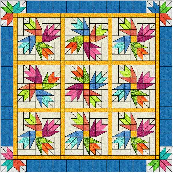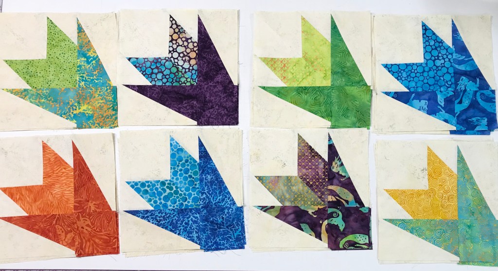 It’s funny how this quilt came about. It stared with Island Batik’s fabric line: Tropical Escape; BlockBuster’s Pointsettia block (a Christmas flower); and it is named after a canyon in Arizona. I named this quilt Copper Canyon Blooms as I think they look like desert blooms! In the supply list below I’ve given you fabric requirements for both the 6 block top and the 9 block top.