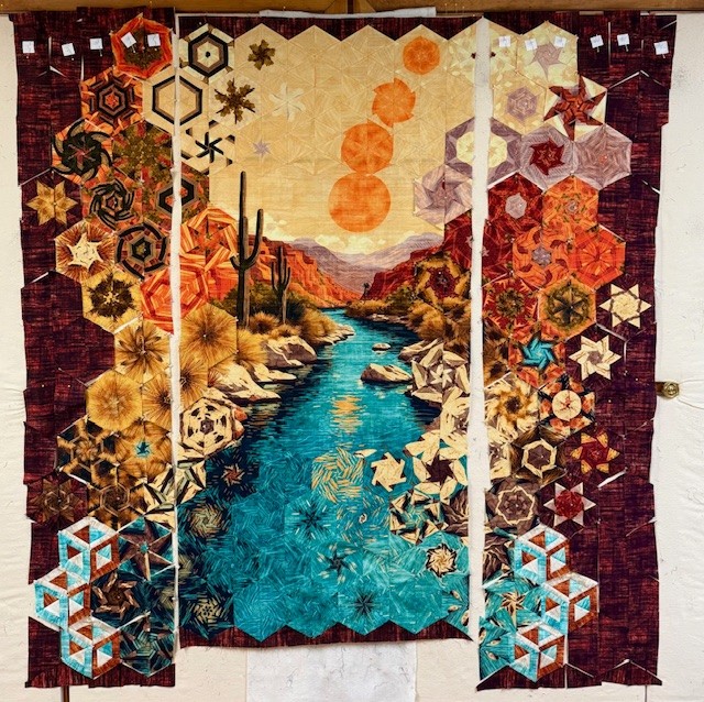 Canyonlands top is together and ready for quilting. Canyonlands measures 63″ x 66″. I call it “Bad Moon Rising” after the Creedence Clearwater Revival song from 1969. Geez, I was in high school then. I just love the way river winds it way through the canyon and pools between the Hollow cubes.
