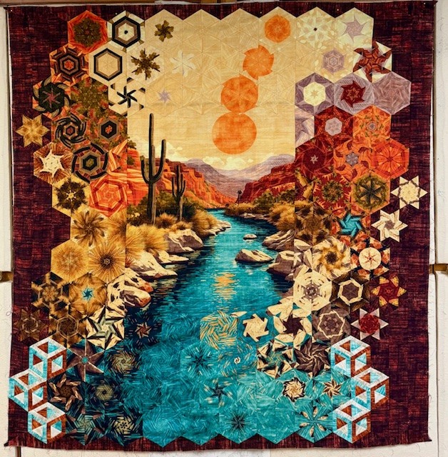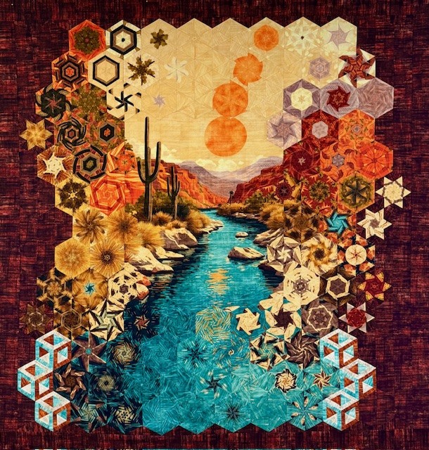 Swan Song measures 67″ x 62″ (unquilted). The large block representing the sun is 15″. It was made with the Star 60 Tool and the Star 60 Log Cabin Technique Sheet. The blue 5″ cubes represent rocks. They were made with the Star 60 Tool and the Hollow Cube 60 Technique Sheet.