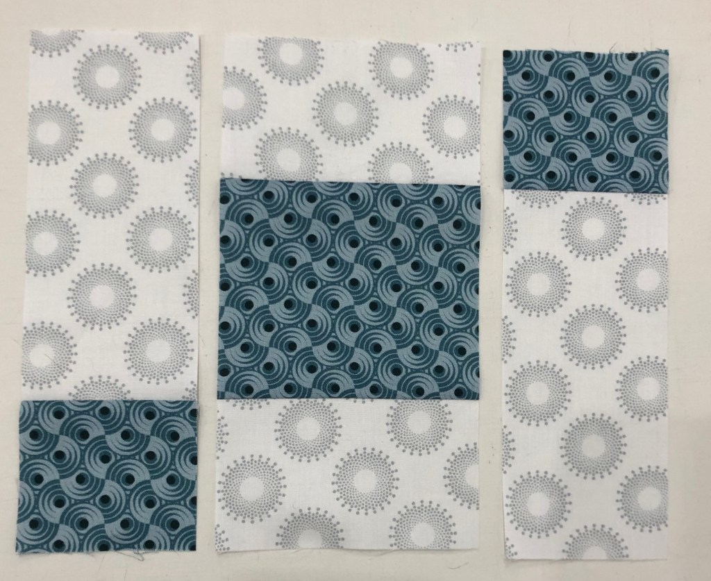 Step 4 – Lay out the pieces from Strip Set A and Strip Set B as shown in the diagram. Stitch an A sub-cut to each side of a B sub-cut.