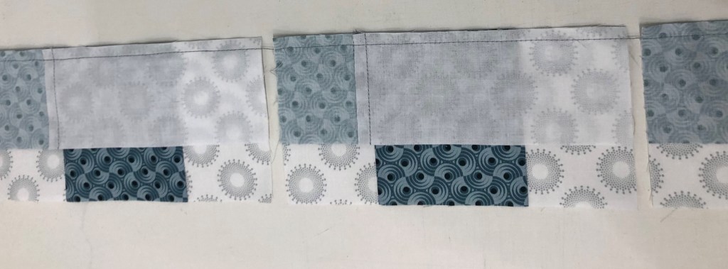 Sub-cut into units the same size as the width that you cut the strips. In this case my strips were 2 3/4″ wide. Chain stitch down the long side of the layered pair.
