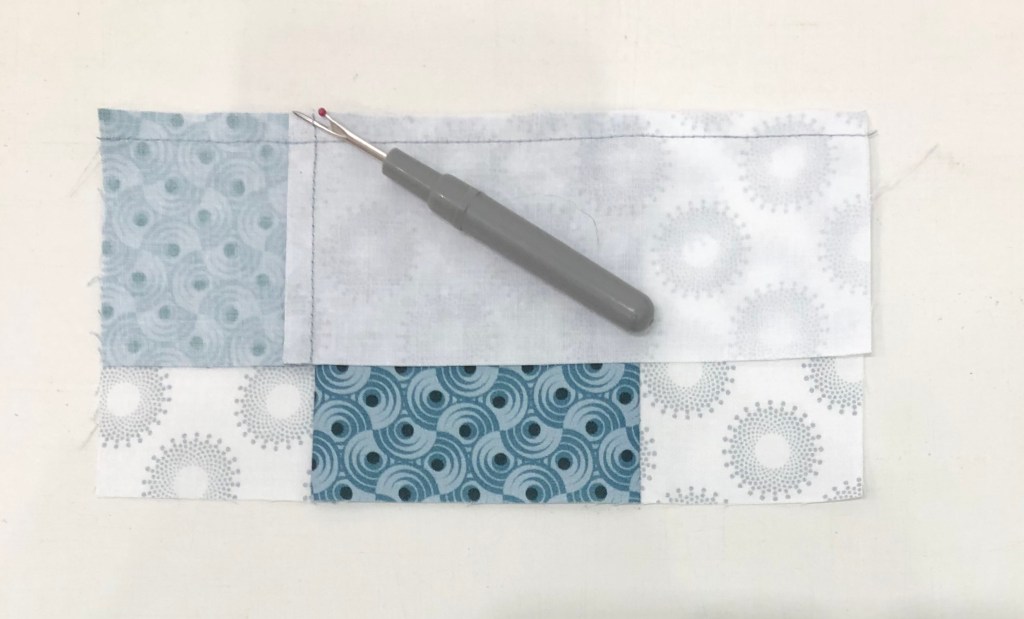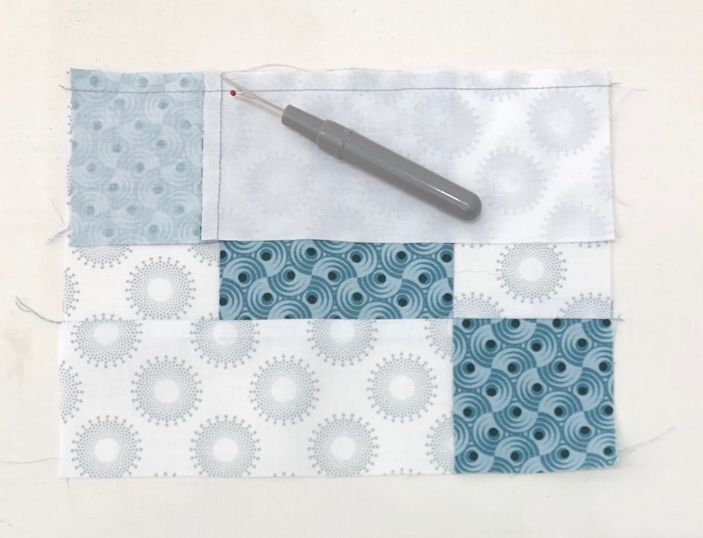 Step 5 – Press the units so that the seams spin. To spin the seams, lay the last sewn seam east to west on the mat, remove the two or three threads in the center on both sides that run north to south, and press so all the seams go in the same direction.
