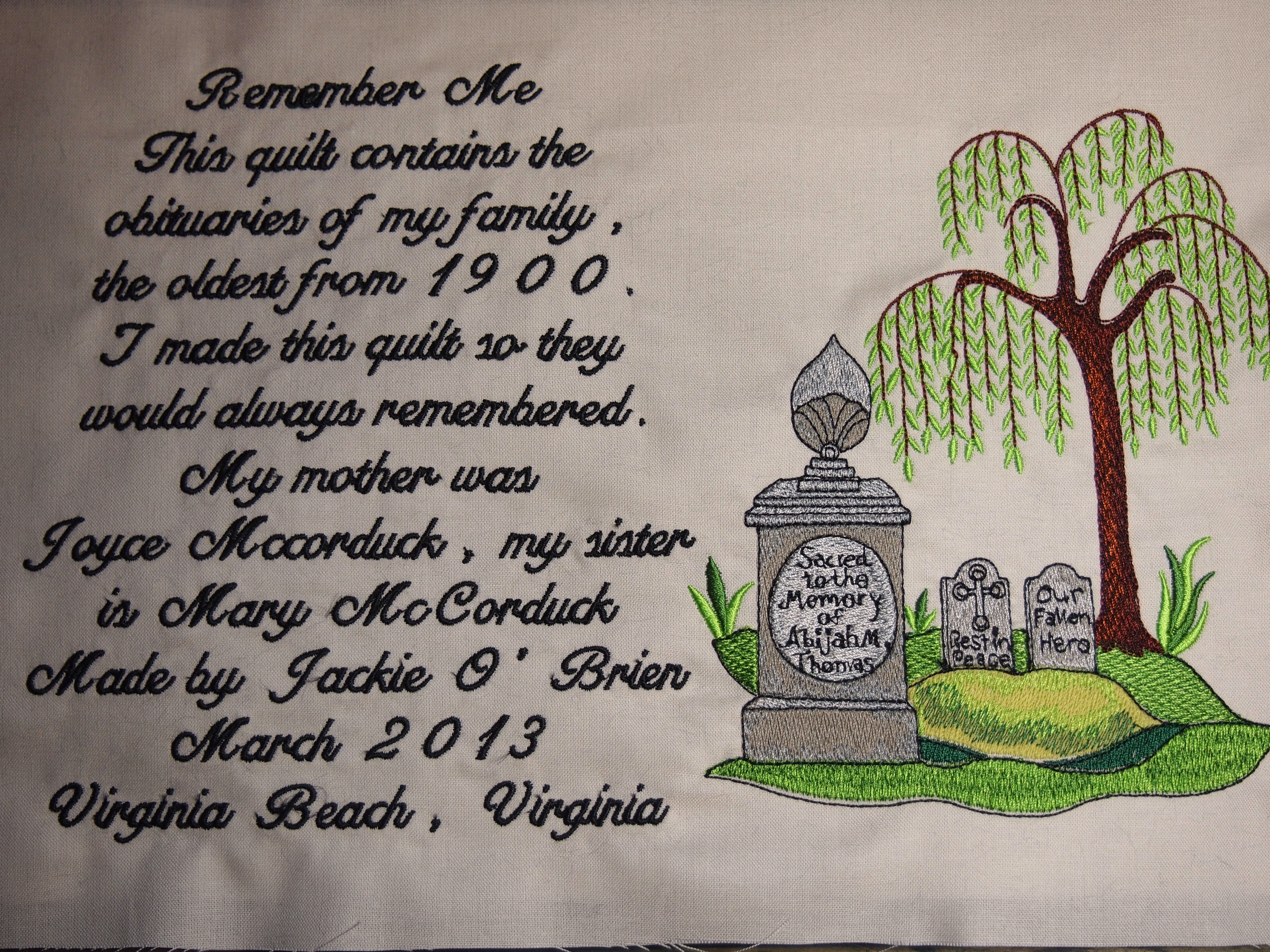 “Remember Me” has won a 1st place ribbon! This quilt consists of Rapid Fire Lemoyne Star blocks and machine embroidered blocks. There are 22 machine embroidered obituaries from my family the McCorducks, Lansings, and Fischers, the oldest is from 1900 (113 years ago).