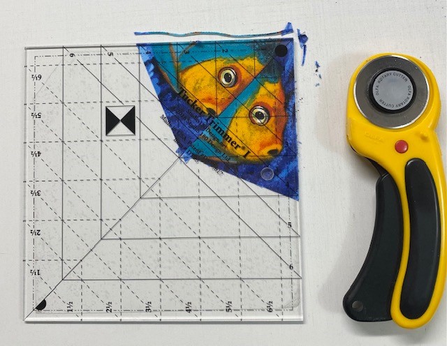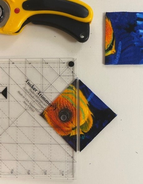 My octagon blocks will be 6″ finished. Therefore, I can use my Tucker Trimmer I and square up my blocks to 6 1/2″. Make sure the intersecting lines for 6 1/2″ are over the center of the block and trim as shown above.