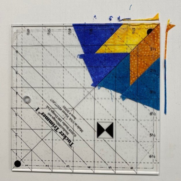 I use my Tucker Trimmer I to cut my Corner Squares from my 3″ WOF strips.