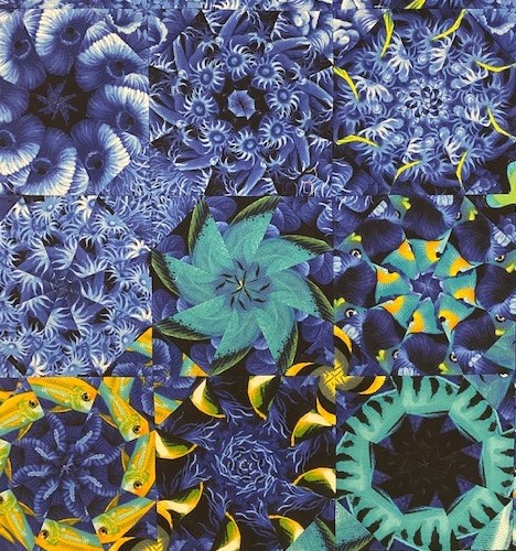 Something Fishy was made with fabric called Atlantis by Sentimental Studios for Moda. I have had this 6 yard piece in my One Block Wonder (OBW) stash for 12 o 13 years. Evidently I like to age my fabric before I cut it up.