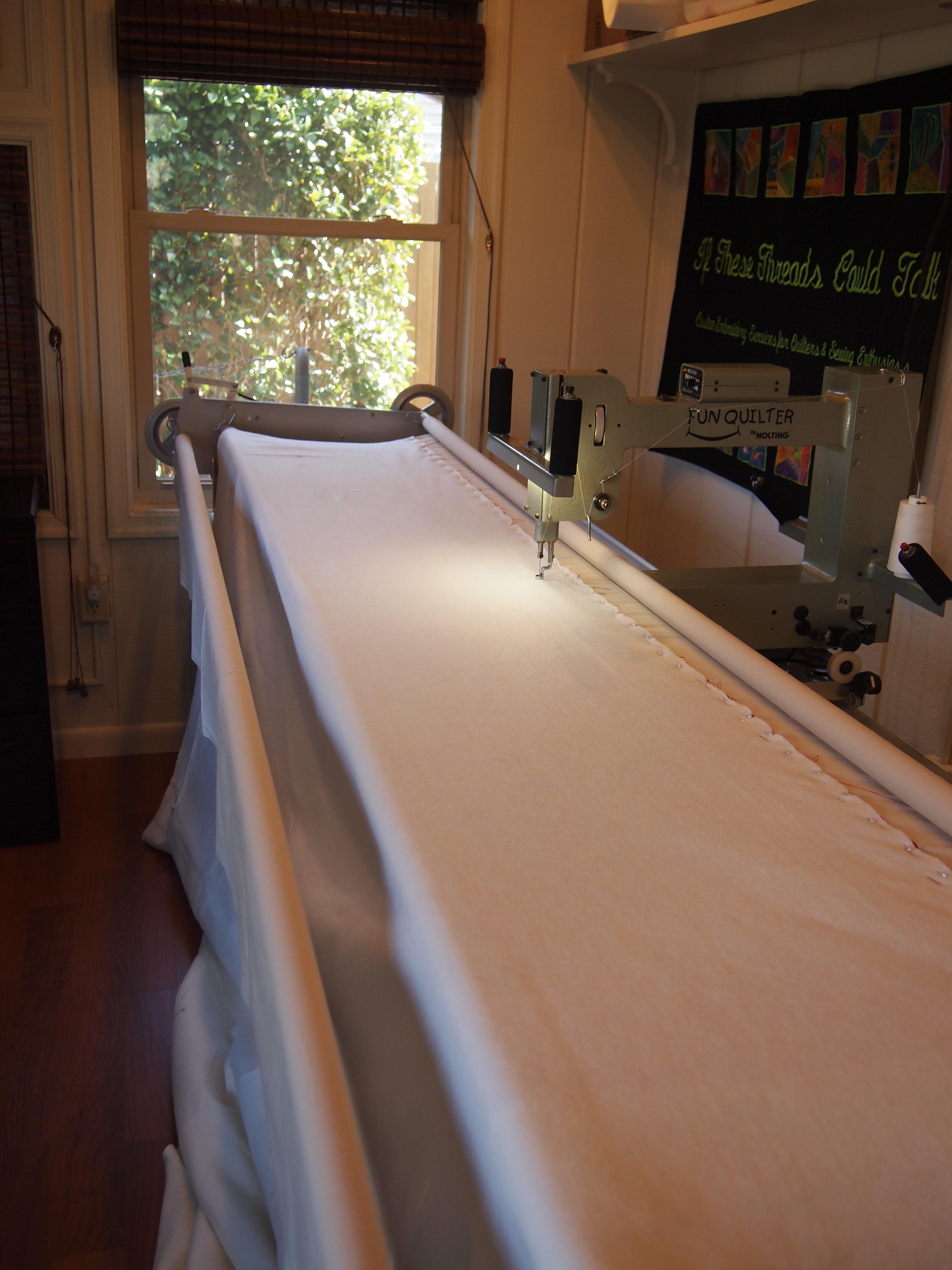 My mug rug top measures 8 1/2″ by 11 1/2″ so I cut a piece of scrap batting & backing one inch larger, 9 1/2″ by 12 1/2″. Using my walking foot I quilted the 3 layers using a simple cross hatch design with Ivory Aurifil thread.