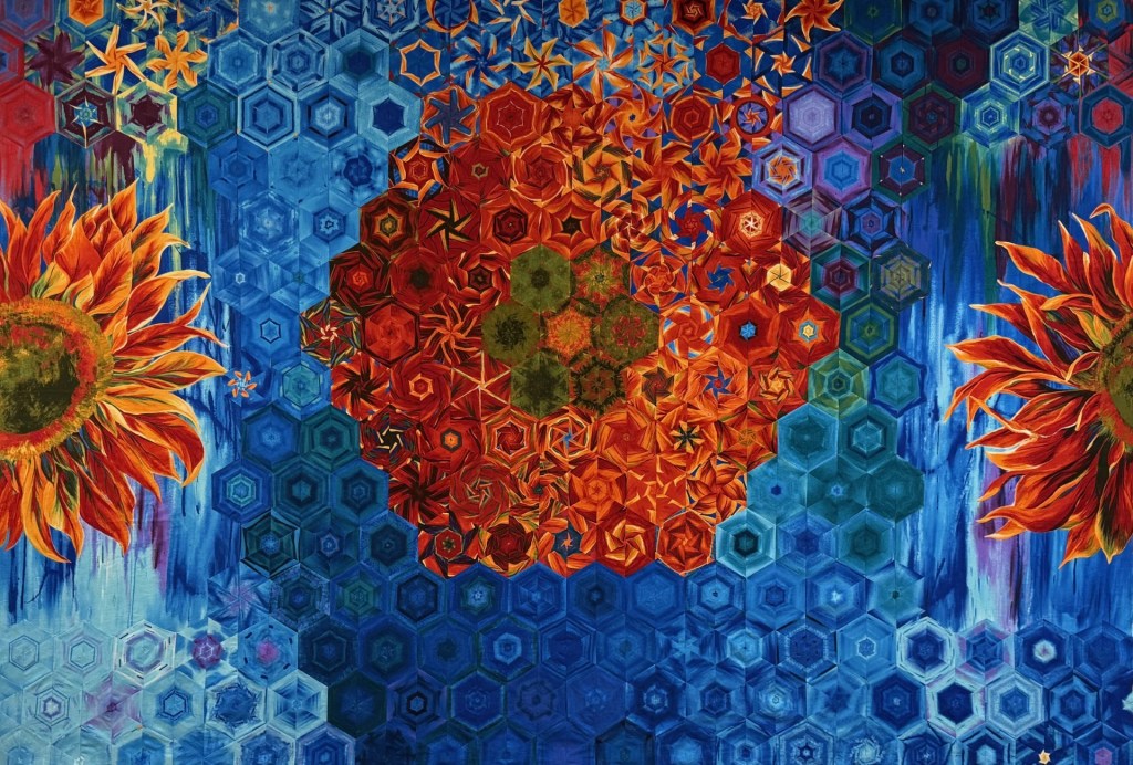 I didn’t want to just design what was expected. The words that kept creeping into my mind were mutual attraction, cross pollination. I decided to create a flower in the center that came from a seed dropped by a bird. My design wall is 106″ wide by 72″ tall. That’s why my OBW’s look like murals. I filled my design wall and still had 63 hexies left over.